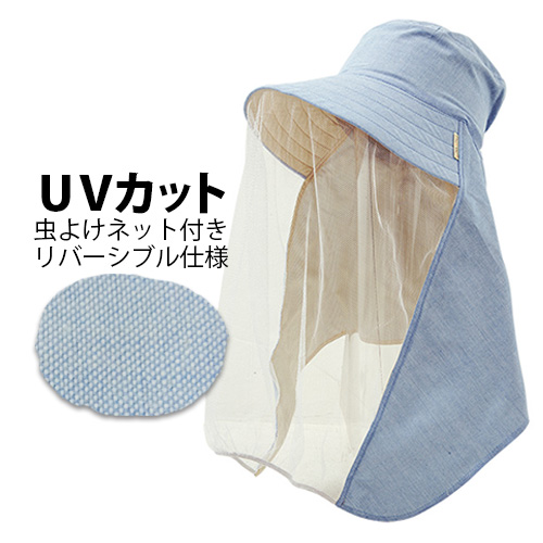 リバーシブル農園フード 防虫ネットタイプ シャンブレーサックス NSR830WH-SS (レディース) 年間 農園帽 リバーシブル UVカット 頭周り約59センチ のらスタイル