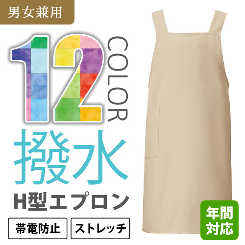 豊富な12カラーから選べる”撥水エプロン”!水しぶきや汚れをはじくのでイベント、カフェ、軽作業など幅広く使用できます。肩ヒモの幅が広めで背中に横ヒモがついている「H型」だから、作業中も肩からヒモが落ちにくく、また着用も簡単ラクラクすっぽりかぶるだけ!