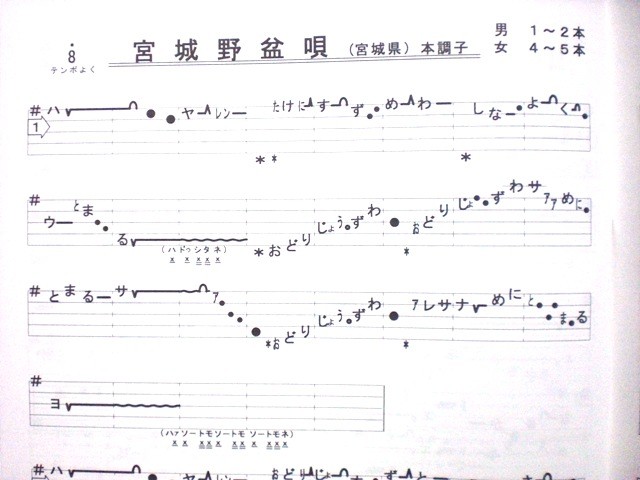この楽譜は、五線譜上に、民謡の歌詞・拍子・節回しなどを表し、メロディーと歌詞を同時に見ながら唄える民謡の唄譜集です。