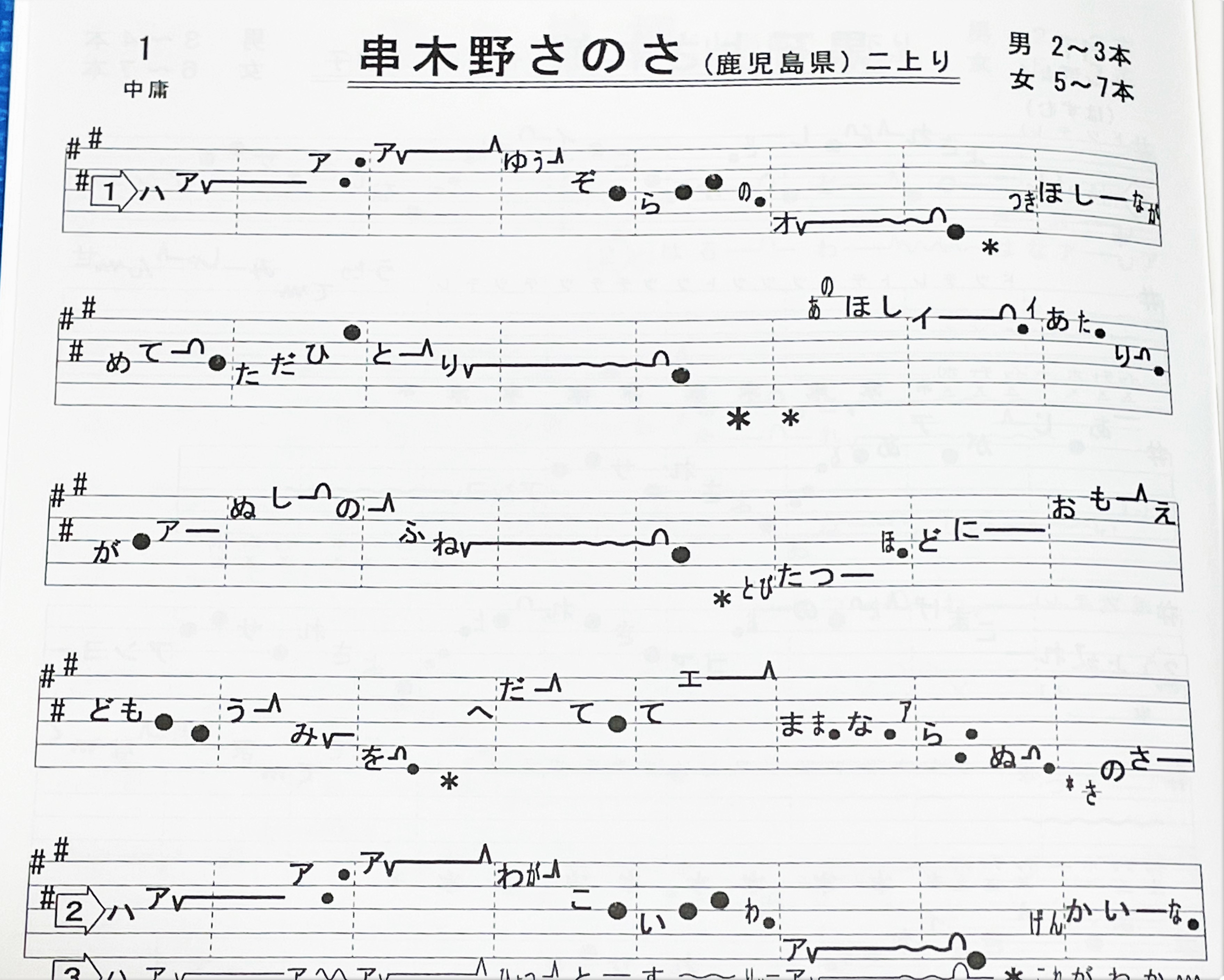 この楽譜は、五線譜上に、民謡の歌詞・拍子・節回しなどを表し、メロディーと歌詞を同時に見ながら唄える民謡の唄譜集です。
