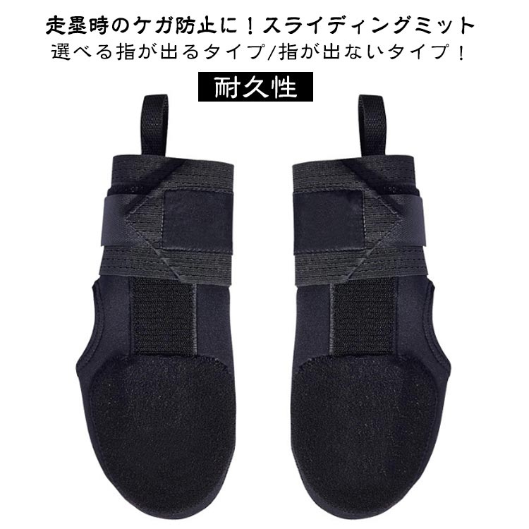 | 走塁時のケガ防止に!スライディングミット 選べる指が出るタイプ/指が出ないタイプ! 突き指や、相手選手のスパイクによる怪我など…走塁、盗塁時に起こしがちなアクシデントから手をガードする、専用の手袋です。 手首を面ファスナーでサイズを調整しながら、しっかり固定して使用。 通気性に優れた素材を使用しているので、使用時も快適に過ごせます。走塁時の手首や指のケガから、選手の大切な体を守るアイテム。余計な心配をせずに、試合に集中できます。 野球だけでなく、ソフトボールにもご利用いただけます。 | |