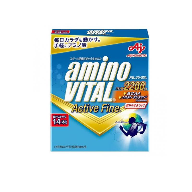 【商品名】アミノバイタル アクティブファイン【製造販売会社】味の素(AJINOMOTO)【ご使用について】【お召し上がり方】1日1〜3本を目安に、水などの飲料と一緒にそのままお飲みください。【原材料】グルタミン、ロイシン、イソロイシン、バリン、シスチン、酸味料、ショ糖脂肪酸エステル、甘味料(アスパルテーム・L-フェニルアラニン化合物)、貝Ca、香料、ナイアシン、パントテン酸Ca、V.B6、V.B1、V.B2、V.A、調味料(アミノ酸等)、V.D、V.B12