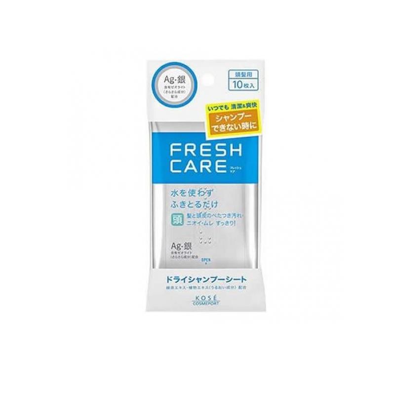 【商品名】フレッシュケア ドライシャンプーシート【このような場合に】病気などでシャンプーできないとき、徹夜明け、忙しい朝、旅行中の車内、加齢臭等ニオイが気になるとき、介護用として、スポーツのあと、キャンプなどアウトドア【製造販売会社】コーセー(KOSE)【ご使用について】【使用方法】フラップのOPEN側から開け、1枚ずつ取り出してお使いください。目のあらいブラシなどにつけて使うことも出来ます。【使用上の注意】・乾燥による品質の劣化を防ぐため、ご使用後はフラップをきちんとしめ、日のあたるところや高温のところに置かないでください。・開封後はなるべくお早めにお使いください。・衛生上1度使用したシートは再度使用しないで下さい。・シートは水に溶けないのでトイレ等に流さないで下さい。・洗面台や鏡台、家具などの表面をふいたり、シートを放置したりしないで下さい。・傷やはれもの、湿疹等、お肌に異常がある場合はご使用にならないでください。・使用中、赤み、はれ、かゆみ、刺激等の異常があらわれたときは、直ちに使用をやめ、皮膚科専門医などへご相談下さい。そのまま使用を続けますと症状が悪化することがあります。・目に入ったときは、すぐに洗い流してください。・乳幼児の手の届かないところに保管してください。【成分・添加物】水、エタノール、BG、カミツレエキス、チャエキス、PEG-40水添ヒマシ油、クエン酸、クエン酸Na、メントール、(銀/亜鉛/アンモニウム)ゼオライト、メチルパラベン、香料