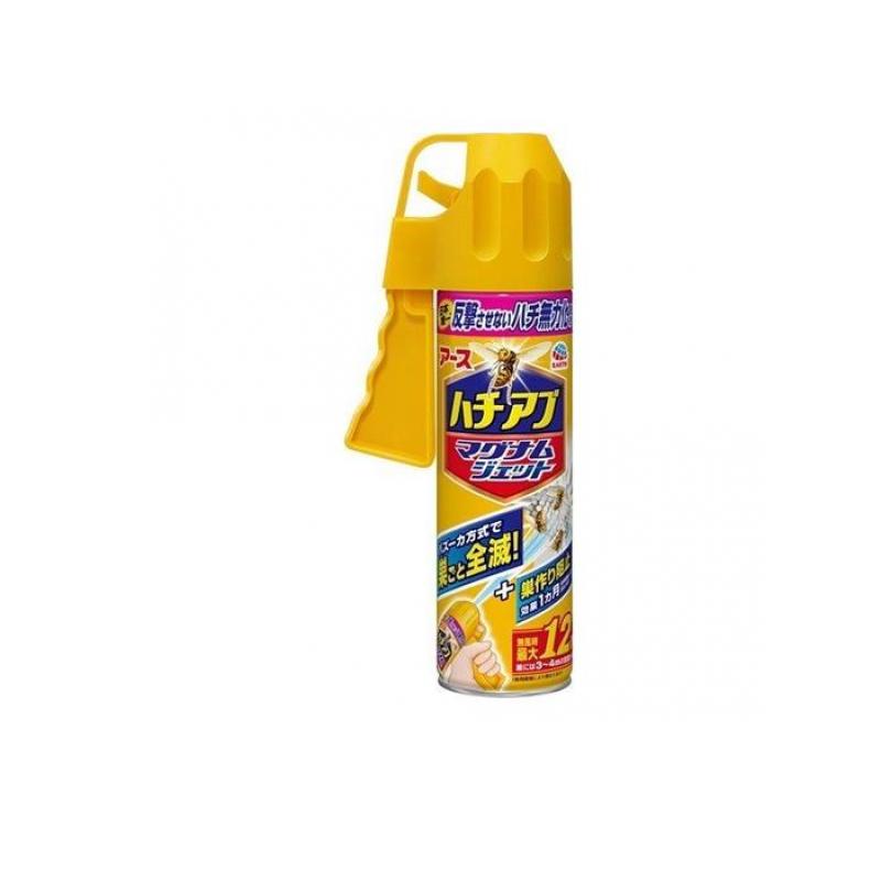 アシナガバチ、クマバチ、スズメバチ、ツマアカスズメバチ、アブ、ブユ、クモ、ケムシ、ムカデ、カメムシ【製造販売会社】アース製薬(EARTH)【ご使用について】【使用方法】・グリップを起こして、グリップ部分を握ってください。※本品は強力噴射のため、約45秒で全て噴射されます。<ハチの駆除>・ハチなどの屋外の害虫に適量を直接噴射してください。・駆除したハチは直接手で触れないでください。<ハチの巣の退治>・必ず皮膚の露出しない防護服、手袋、保護メガネなど(ハチの針が皮膚まで届かないもの)を着用し、日没後に行ってください。・3〜4mの距離から10〜30秒噴射してください。・本品はスズメバチを対象とした商品ではありません。スズメバチの巣退治は必ず「スズメバチマグナムジェットプロ」を使用するか(25cmまで)、専門家に依頼してください。【使用上の注意】・使用前に必ず製品表示を読み、十分理解した上で使用してください。・定められた使用方法を必ず守ってください。・室内では使用しないでください。・火炎に向かって噴射しないでください。・人体に向かって噴射しないでください。また、噴射気体を吸入しないでください。・アレルギーやかぶれなどを起こしやすい体質の人、喘息の症状のある人は、薬剤を吸い込んだり、触れたりしないようにしてください。・使用する際は必ず防護服、手袋などを着用し、皮膚の露出を避けてください。特にハチの巣を退治する場合は必ず日没後に行い、皮膚の露出しない防護服、手袋、防護メガネ等(いずれもハチの針が皮膚まで届かないもの)を着用してください。・噴射場所の周り、風下には人がいないことを確認し、風上から噴射してください。下向きに噴射するときは、グリップを持って缶を一度真下に向けてから噴射してください。・薬剤が皮膚についたときは、石けんを用いてよく洗ってください。また、目に入ったときは、直ちに水で洗い流してください。・万一身体に異常が起きた場合は、直ちに本品がピレスロイド系殺虫剤であることを医師に告げて、診療を受けてください。・薬剤のかかり具合が不十分の場合、効果が出にくいため、薬剤が十分かかるように噴射してください。・変色やシミの恐れがあるので、自動車、壁などの塗装面、大理石・御影石等の石材、コンクリート、白木にはかからないように注意してください。・植物の中には直接かかると薬害が出る場合があります。・ハチに刺された場合は、すぐに医師の手当てを受けてください。【素材】●有効成分