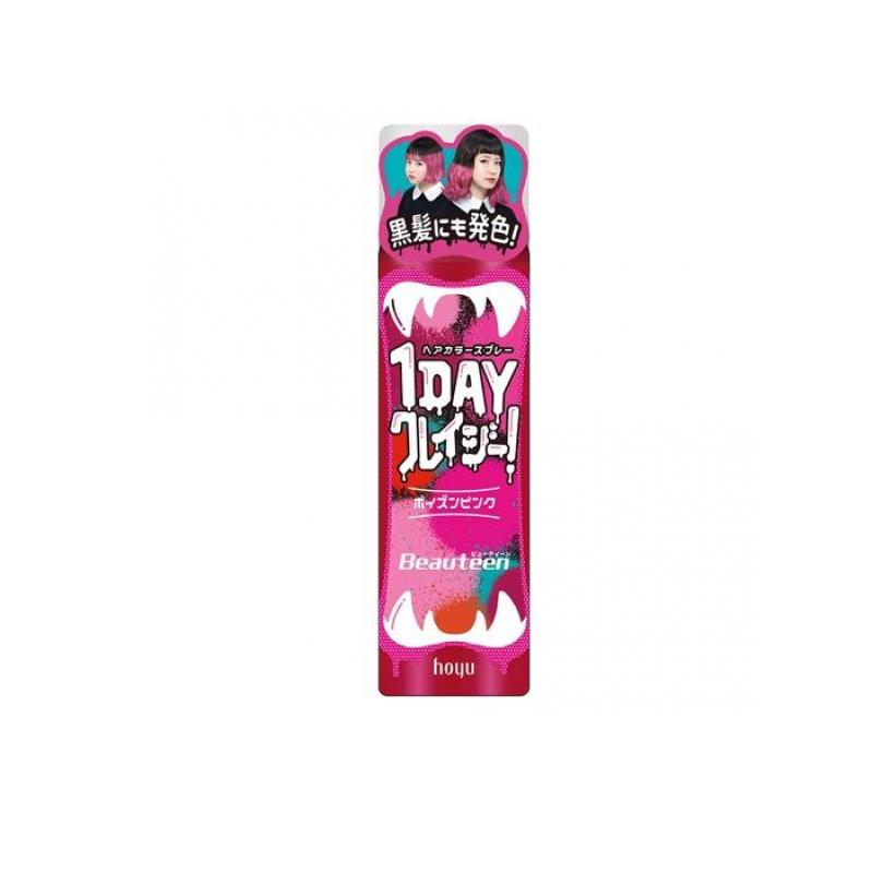 【商品名】ビューティーン 1DAYクレイジー! ポイズンピンク【製造販売会社】ホーユー(hoyu)【ご使用について】【使用方法】(1)使用前に、玉の音がしてから上下に10回以上よく振ってください。(2)衣類等を汚さないようにケープ等でおおってください。(3)髪から15cmくらい離してスプレーします。※逆さまにして使用しないでください。※寝具等の汚れを防ぐため、就寝前にはシャンプーをしてください。【使用上の注意】・衣服等につくと落ちませんので、ご注意ください。・汗や雨等で髪がぬれると、色落ちします。手や衣服、帽子等が汚れないように、ご注意ください。・目、顔にかからないように注意してください。目に入ったときはすぐ洗い流してください。・お肌に異常が生じていないかよく注意して使用してください。・刺激、色抜け(白斑等)や黒ずみ(製品による汚れを除く)等の異常が出たら使用を中止し、皮フ科医へご相談ください。・傷、湿疹等、異常のある部位には使わないでください。・幼小児の手の届かない所に保管してください。【成分・添加物】DME、エタノール、(アクリレーツ/ジアセトンアクリルアミド)コポリマーAMP、オレス-10、グリセリン、ゴマ油、ジフェニルシロキシフェニルトリメチコン、(+/-)カーボンブラック、コンジョウ、酸化チタン、酸化鉄、シリカ、マイカ、赤226、黄205、青404