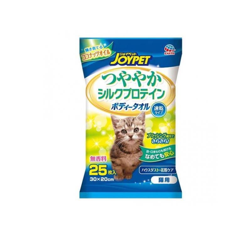 【商品名】JOYPET(ジョイペット) ボディータオル つややかシルクプロテイン 猫用【製造販売会社】アース・ペット(EARTH PET)【ご使用について】【使用方法】・本品を使用する前によくブラッシングし、被毛のもつれをほぐしてください。・1枚ずつ取り出して愛猫の体を拭いてください。・使用後は水洗いや別の布での拭き取りは不要です。ブラッシングして毛並みを整えてください。【使用上の注意】・用途以外に使用しないこと。・人やペットの皮膚に傷、皮ふ炎(かぶれ・ただれ)などの異常がある時は、悪化させるおそれがあるので使用しないこと。また本品の使用により異常が見られた場合は、使用を中止し、本品を持って医師または獣医師の診察を受けること。・本品が愛猫の目・口・耳に入らないように注意すること。・開封後は乾燥を防ぐため、必ずシールをしっかり閉めること。・本品は水には溶けないので水洗トイレには流さないこと。・乳幼児の手の届かない場所に保管すること。・直射日光を避け、なるべく涼しい場所に保管すること。【素材】●素材