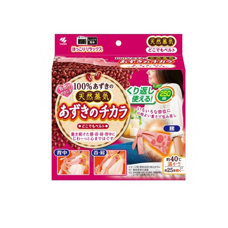 【商品名】小林製薬 あずきのチカラ どこでもベルト【保管上の注意】涼しい風通しのよい場所に保管する。【製造販売会社】小林製薬【ご使用について】【使用方法】(1)透明袋から製品を取り出す。花柄の面を内側にして半分に折り、あずき部分にひもを重ねて電子レンジ中央に置く。(置く部分の汚れを拭き取る。)(2)加熱時間に従い加熱する。600Wを超える出力では加熱しない。※加熱中は電子レンジのそばを離れない。(3)起毛の面を肌側にして使用する。25分を目安に使用する。首には結んで使用しない。※電子レンジ機能以外での加熱不可。※自動温め不可。※所定時間を超えて加熱しない。※業務用電子レンジ使用不可。【使用上の注意】・皮ふに異常(外傷、湿疹、かぶれ、やけど、日焼けによる熱傷など)のある部位や発熱している部位には使用しない。・やけどのおそれがあるため、肌に直接使用せず、熱や湿気に強い衣類の上から使用する。・異常がある場合はすぐに使用を中止し、皮ふ科医等に相談する。・自らの意思で本品を取り去ることのできない人、子供および泥酔時や就寝中は使用しない。・ひもに引火するおそれがあるため、火気のそばでは使用しない。・糖尿病など、温感および血行に障害をお持ちの方、肌の弱い方はやけどのおそれがあるため、医師又は薬剤師に相談する。・長時間、同じ部位に当てない。・こげたり、破れた場合は使用しない。【素材】●素材
