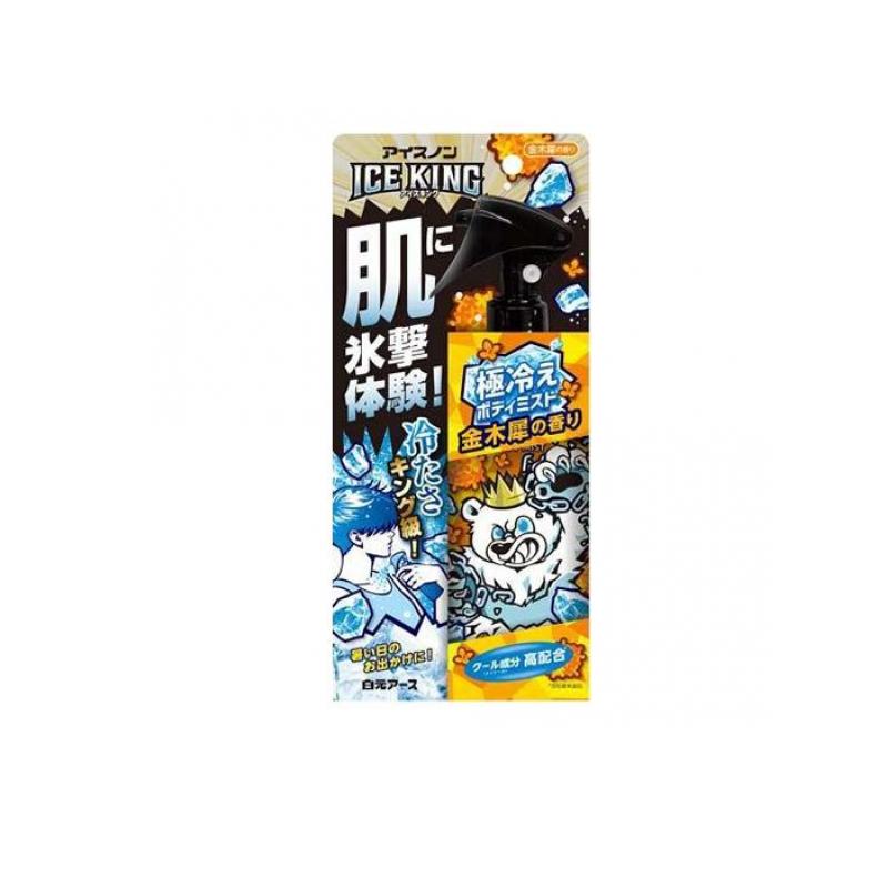 【商品名】アイスノン ICE KING 極冷えボディミスト 金木犀の香り【このような場合に】通勤、通学時やレジャー・おでかけ時、スポーツ後やリフレッシュしたい時に【製造販売会社】白元アース【ご使用について】【使用方法】・ストッパーを[ON]側から押し込んでください。・胸元や腕、脚などには約10cm離して適量を噴霧し、首や背中には手のひらに噴霧してお肌にぬってください。・1カ所に集中してスプレーしすぎないでください。過度な刺激になるおそれがあります。・使用後はストッパーを[OFF]側から押し込み、立てて保管してください。※約460回スプレーできます。【使用上の注意】・メントールの刺激に弱い方、アルコール過敏症の方や皮フの弱い方、乳幼児には使用しない。・顔や髪、除毛直後の部位、粘膜付近への使用は避け、傷、はれもの、にきび、湿疹、かぶれ、やけど、日焼けによる熱傷など、肌に異常のある部位には使用しない。・吸入したり目に入ったりしないように注意する。・小児に使用させる場合は、保護者の指導監督のもとに使用させる。・火気の近くや火気を使用している室内で使用しない。・目に入った場合は、すぐに水で充分に洗い流す。・口に入った場合は、水で口の中をよくすすぐ。・肌に異常を生じていないかよく注意して使用する。肌に合わない時や、使用中、赤み、はれ、かゆみ、刺激、色抜け(白斑等)や黒ずみ等の異常が出た時、また日光があたって同じような異常が出た時は、使用を中止し、皮フ科医へ相談する。使い続けると症状が悪化することがある。・用途以外に使用しない。・衣類につかないように注意する。・床、テーブル、プラスチック(樹脂製品)、アクセサリー、腕時計についた場合は、変質する場合があるので、すぐ拭き取る。・車内や直射日光の当たる場所を避け、涼しいところに保管する。・乳幼児や認知症の方などの手の届くところに置かない。・逆さではスプレーできない。【成分・添加物】エタノール、水、メントール、イソプロパノール、PG、フェノキシエタノール、エチルパラベン、香料、ミリスチン酸イソプロピル、加水分解コラーゲン、ヒアルロン酸Na
