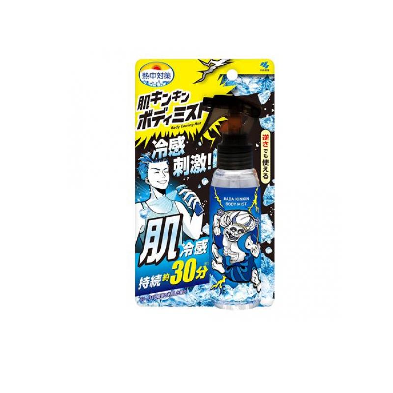 【商品名】熱中対策 肌キンキンボディミスト【製造販売会社】小林製薬【ご使用について】【使用上の注意】●メントールの冷感刺激に弱い方、アルコール過敏症の方、特に肌の弱い方、幼児は使わない。●皮ふに異常(傷、はれもの、湿疹、やけど、日焼けによる熱傷など)があるところ、顔、粘膜、除毛直後の部位には使わない。●肌に合わない場合は使用を中止する。●肌の弱い方はあらかじめ少量で試し、肌に異常がないことを確認し使用する。●肌の薄い部位(首、脇、ひざの裏など)では強い冷感を感じることがあるので注意する。●メントール等揮発性成分が配合されているため、目や鼻に刺激を感じることがある。●吸い込まないよう注意する。●日焼け止めなどの油分が多い成分を塗っていると、効果が感じにくくなるおそれがある。●火気の近くで使用しない。●車内、その他密閉空間では使用しない。●用途以外には使用しない。●小児、認知症の方などの手の届くところに置かない。●変色または変質する場合があるため、床や洗面台、家具、皮革製品、樹脂製品、アクセサリー、腕時計についた場合はすぐに拭き取る。●車内や高温の場所、直射日光の当たる場所を避け、涼しい場所に保管する。●衣類に付着した際は、色落ちや色移りのおそれがあるため、すぐに流水で洗う。<応急処置>●強い刺激を感じたとき、かゆみや湿疹、発赤など肌の異常を感じたときは、すぐに使用を中止し、水で充分に洗い流す。●目に入った場合は、すぐに流水で洗い流す。●飲んだ場合は、吐かせずにコップ1〜2杯の水を飲ませる。●異常がある場合は本品を持参し、医師に相談する。【成分・添加物】エタノール、水、メントール