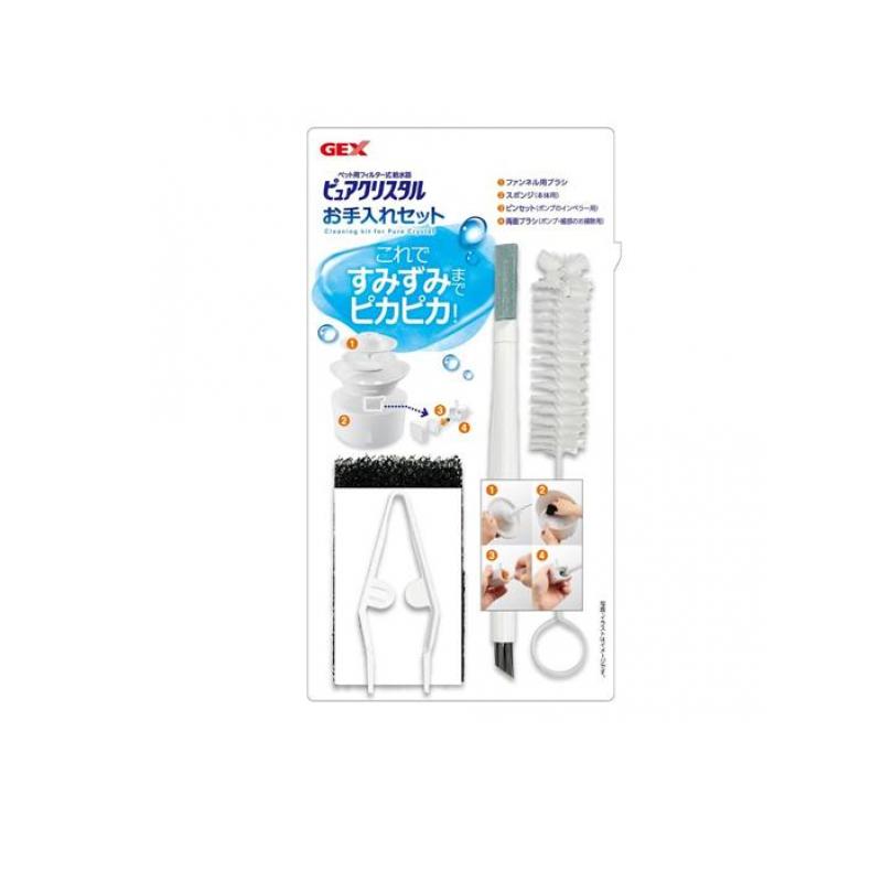 【商品名】GEX ピュアクリスタル お手入れセット【このような場合に】いつでもきれいなお水を与えるために、定期的なポンプのお手入れが必要です。ポンプは分解して内部まで洗浄してください。お手入れが不足すると、ポンプが止まったり水が流れなくなる原因にもなります。【製造販売会社】ジェックス(GEX)【ご使用について】【ポンプのお手入れ方法】1.ポンプカバーを取り外します。2.インペラーカバーを外し、インペラーをピンセットで抜き取ります。3.インペラーの汚れを水洗いし、ポンプ内部も汚れを両面ブラシで落とします。※シャフトに無理な力を加えないでください。4.逆の手順でセットします。●ピュアクリスタルのお手入れには、タワシやシンナー・ベンジン・研磨剤またはアルコール及び有機溶剤を含むガラスクリーナーなどは使用しないでください。●使用後は流水で中性洗剤や汚れをよく洗い流し、水気を切って乾燥させてください。●45℃以上のお湯には使用しないでください。破損や変形の原因になります。【使用上の注意】●本製品はピュアクリスタル専用です。他の目的には使用しないでください。●ポンプ内部に汚れがたまっていたりシャフトがゆがんでいると、インペラーが抜き取りにくい場合があります。●ピンセット本体に過剰な力を掛けると破損する場合がありますのでご注意ください。●両面ブラシの布部分先端はネジ式になっています。ネジが締まっていないと、使用中に外れることがありますのでご注意ください。●スポンジが変色・退色する場合がありますが、品質に問題はございません。【素材】●ファンネル用ブラシ:塩ビ被膜鉄線、ナイロン