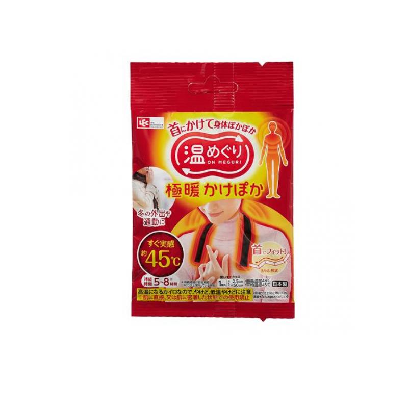 【商品名】レック 温めぐり 極暖かけぽか 首にかける使い捨てカイロ【製造販売会社】レック(LEC)【ご使用について】【使用方法】・袋から製品を取り出し、もまずに首周りにかける。・その際、直接肌にあてないよう厚めの衣類の上、又は厚めの布等に包んで、使用してください。・開封すると温かくなってくるので、すぐに使用してください。【使用上の注意】・肌に直接、又は肌に密着した状態での使用禁止。直接肌にあてず、厚めの衣類の上又は厚めの布等に包んで使用する。・屋内での使用禁止。・圧迫した状態での使用禁止。本品を首にかけた上からサポーターやベルトなどで圧迫しない。【素材】鉄粉、水、活性炭、吸水性樹脂、塩類