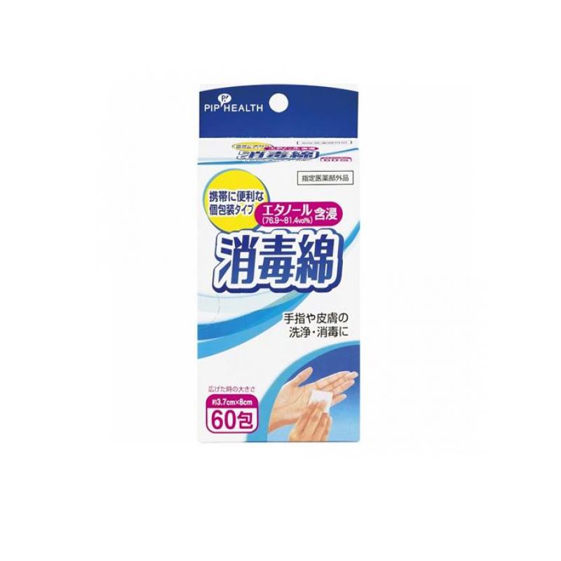 ●ピップヘルス 消毒綿●エタノール(76.9〜81.4vol%)含浸綿。●手指や皮膚の洗浄・消毒に。●医師の指導のもと自己注射をされている方に。●個包装タイプなので携帯に便利。●内容量:本品1包は脱脂綿0.24g(約3.7cm×8cm)に消毒液1.26mLを含侵させたものである。●脱脂綿サイズ:約3.7cm×8cm(広げた時の大きさ)●販売名:酒精綿G〈指定医薬部外品〉