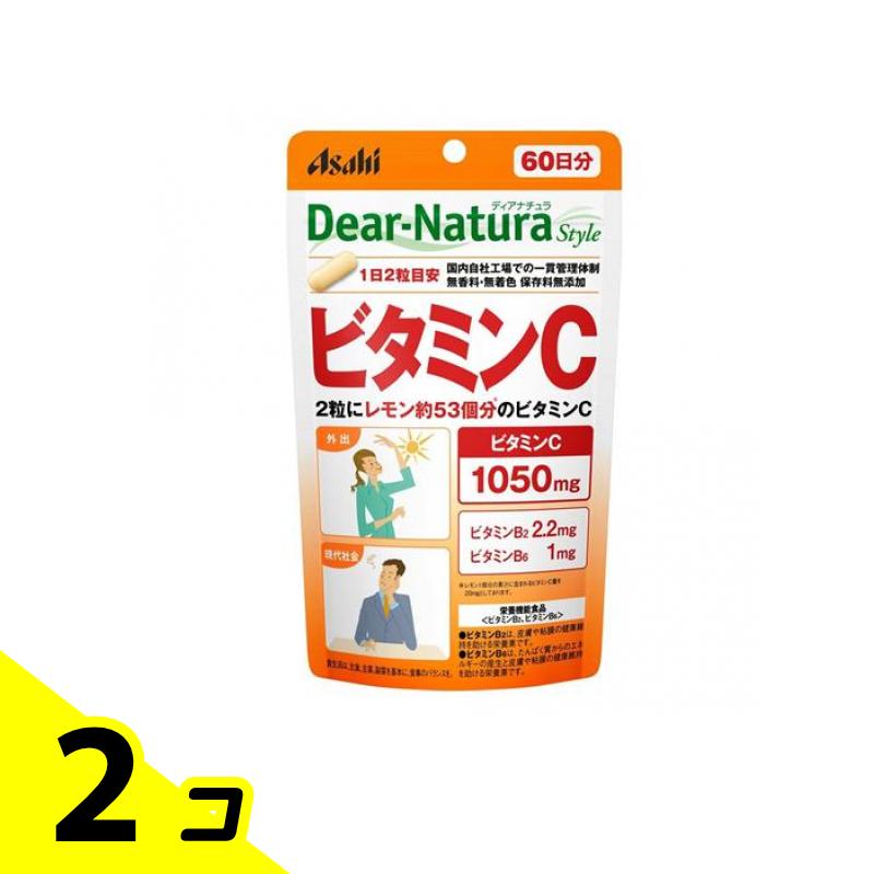 使用期限は6カ月以上先のものを送ります。●アサヒのサプリメント『Dear-Natura Style(ディアナチュラスタイル)ビタミンC』●パウチタイプ●2粒にレモン約52個分(*)のビタミンC![*レモン1個分の果汁に含まれるビタミンC量を20mgとしております。]●2粒にビタミンC 1050mgとビタミンB2、ビタミンB6を配合しました。●ディアナチュラは「国内工場で生産」「着色料無添加」「厳選した原料」●1日2粒目安。●ビタミン剤/健康食品/栄養補助食品●名称:ビタミンC加工食品●栄養機能食品<V.B2、V.B6>◇ビタミンB2は、皮膚や粘膜の健康維持を助ける栄養素です。◇ビタミンB6は、たんぱく質からのエネルギーの産生と皮膚や粘膜の健康維持を助ける栄養素です。