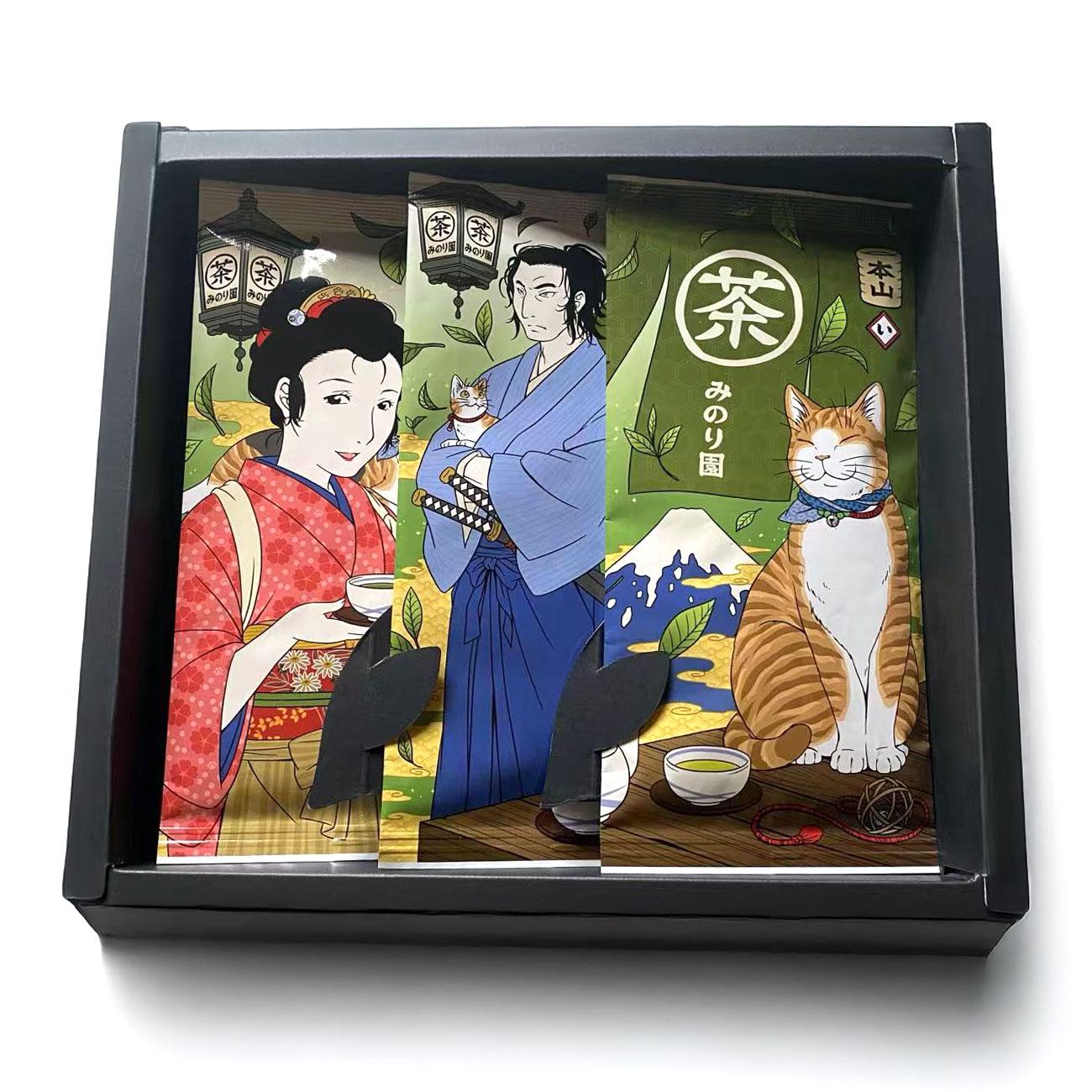 江戸時代の茶屋をイメージしたイラストは、老若男女を問わず、喜んでいただけること間違いなし!また日本のアニメや「Japanese green tea」が大好きな外国人、海外の方へのプレゼント・贈り物・お土産にもベストなギフトセットです。