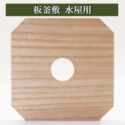 板釜敷(いたかましき)は、釜の下に敷く、四方隅切で、中央に丸い穴の開いた、桐木地の板です。