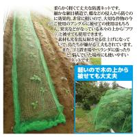 U型アンカーピン 10本組はこちら「ふわっ」と上からかぶせるだけ。野菜たちを守る柔らかく軽くて丈夫な防護ネットです。細かな網目構造で、蝶などの侵入から防ぐのに効果的。非常に軽いので、大切な作物の今ご使用のアングルに被せての使用はもちろん、果実などがなっている木々の上から「フワッ」と被せても使用できます。素材も光を乱反射させる仕上げになっていて、鳥たちが嫌がる工夫もされています。また、ゴミ置き場やベランダに張ったりと、悩んでいた場所にも使いやすいネットです。