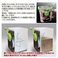 こちら電気代のかからない経済的な家庭用の生ゴミ処理機「自然にカエルS」は好気性(酸素を好む)微生物群のチカラで生ごみを有機分解する生ごみ処理器です。これを使えば、ゴミ出し日までのイヤな臭いを、もう気にすることはありません。使い方はカンタンで、酵素を活性化する機能を持った「エコパワーチップ」を入れた本体に、毎日出る生ゴミを投入してハンドルを数回まわすだけ。チップに含まれる好気性微生物が有機物をどんどん分解してくれます。独自に開発したチップ材は、生ゴミをスピーディーに分解するだけでなく、業界でも非常に珍しい、臭いの発生を抑える性能がありますので、キッチンなどのお部屋の中で使用が可能です。そして、不思議なことに、どんどんと生ゴミを投入していっても、分解された生ゴミは気体等になって無くなるため、量はほとんど増えません。生ゴミの量は約10分の1以下になります。大きさもコンパクトで、置き場所を選びません。電気を一切使わずトラブルも気にせずに長くご使用いただけます。生ゴミを分解したチップ材は、良質の肥料に変わりますので、家庭菜園や鉢植えなどにご使用いただけます。