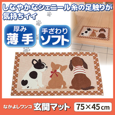 玄関の上り口に使っていただけるデザインマットです。生地はシェニール糸で仕上げていますので、適度な毛並で足さわりが心地よく、素足で歩きたくなるような感触。かわいい3匹の犬が描かれ、見た目でも癒される感じが人気。裏側はスベリ止め加工済み。手洗いもご家庭で可能です。