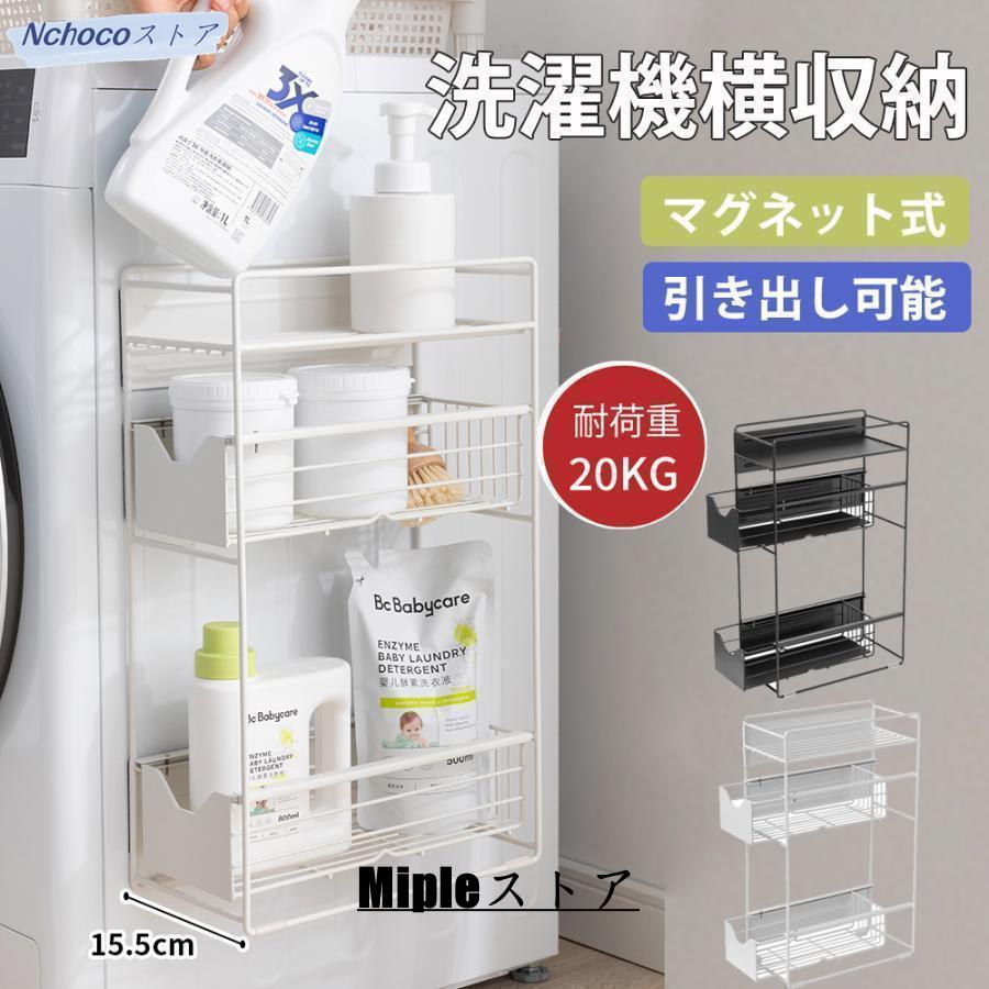 洗濯機横マグネット収納ラック 引き出し 洗濯機 ラック 3段式 収納 マグネット スリム ランドリー 洗濯機横 ランドリー収納 洗面所 すき間収納 隙間収納 15.5cm