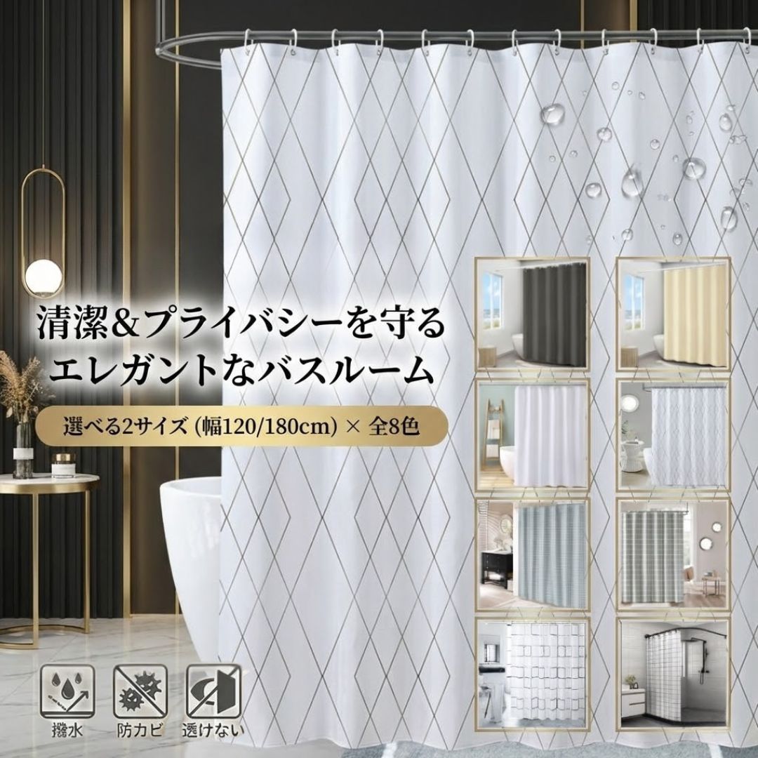 こちらのシャワーカーテンは、高品質なポリエステル素材を使用しており、優れた撥水性を備えています。水滴がビーズ状に弾かれるため、防カビ効果も高く、湿気がこもりやすいバスルームでもカビや雑菌の繁殖を抑制し、清潔で衛生的な状態を長期間にわたって維持しやすくなっています。速乾性にも優れているため、お手入れも簡単です。