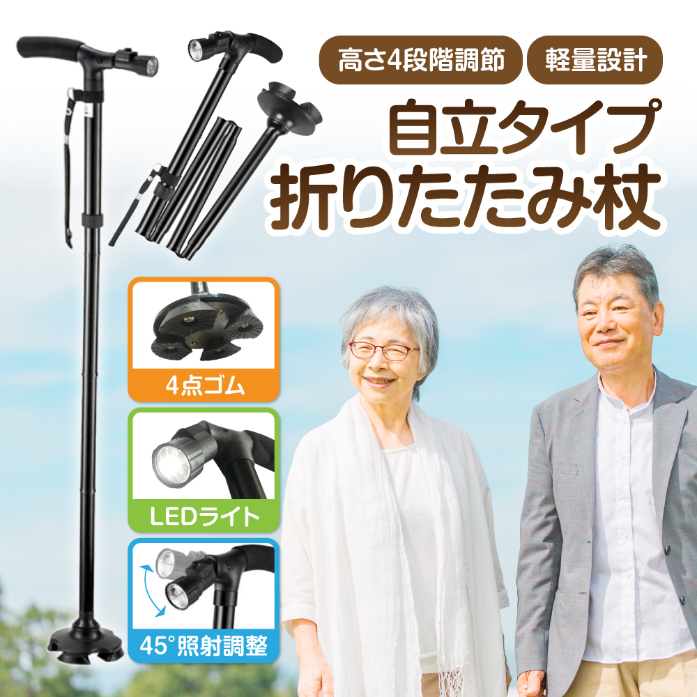 折り畳み 丈夫 4本脚 ウォーキング 冬用 ゴムキャップ 太い かっこいい 80cm 90cm ホルダー 携帯 コンパクト 高級 散歩 先 室内用 プレゼント ledライト スタンド 滑り止め ストッパー 先端ゴム 目印 短め 長い 高さ調節 倒れない 転倒防止 登山 トレッキング 山登り 目印 四つ脚 つえ