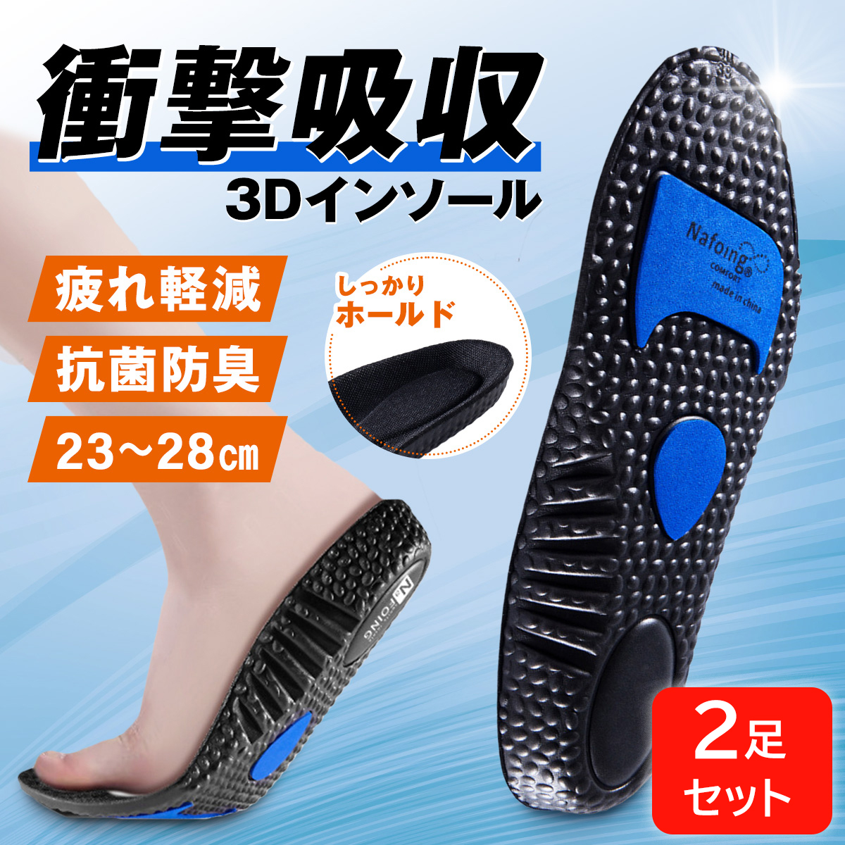 3D立体型設計でずれることなく足の裏にフィット、歩行時の衝撃や痛みを軽減します。