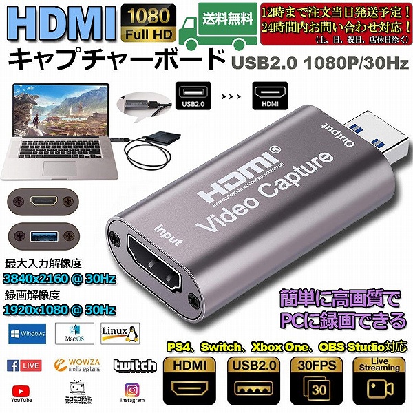 HDMI ビデオキャプチャカード キャプチャーボード HDMI USB2.0 1080P 30Hz ゲームキャプチャー 録画 ライブ会議に適用 ゲーム 送料無料