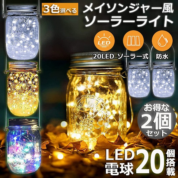 ソーラーライト 2個セット メイソンジャー風 屋外 ガーデンライト ガラスソーラーライト イルミネーションライト LED ソーラー充電式 送料無料