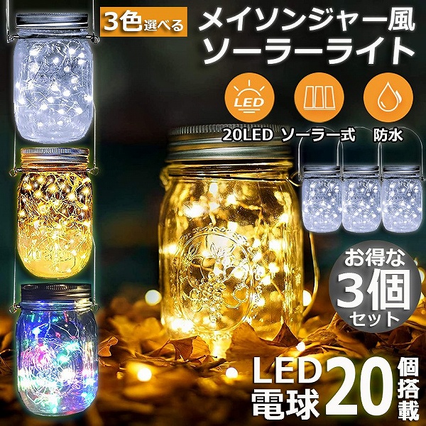 ソーラーライト 3個セット メイソンジャー風 屋外 ガーデンライト ガラスソーラーライト イルミネーションライト LED ソーラー充電式 送料無料