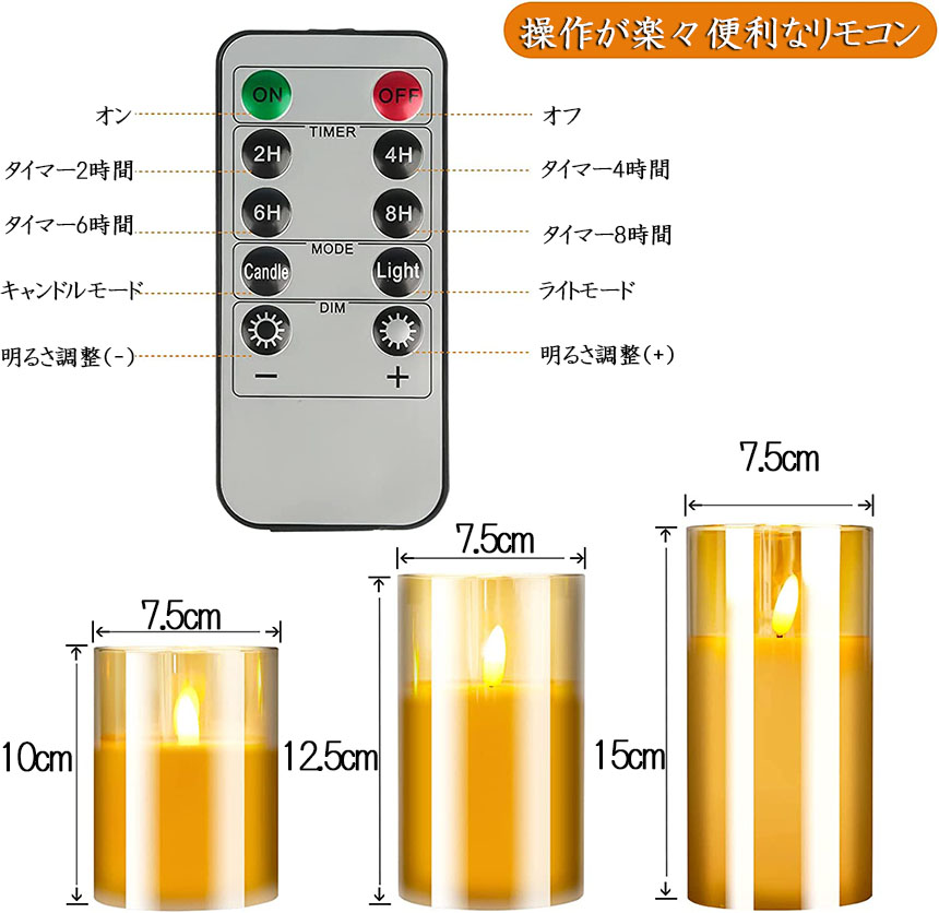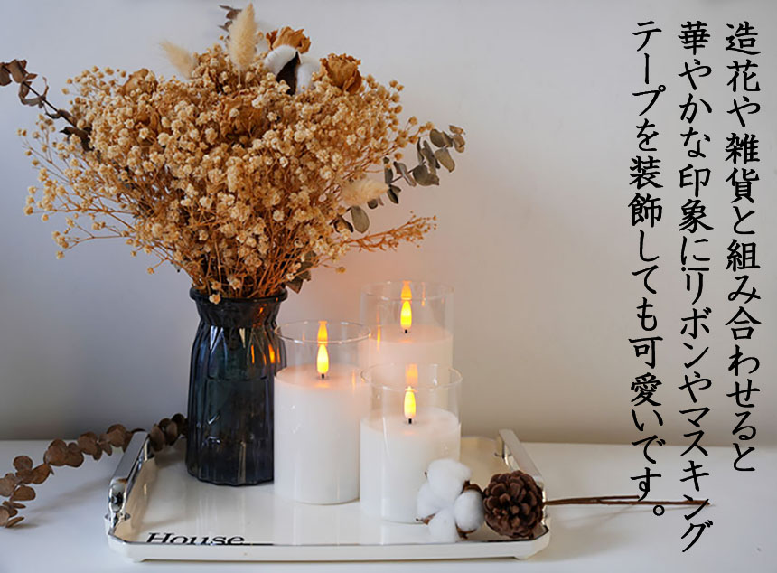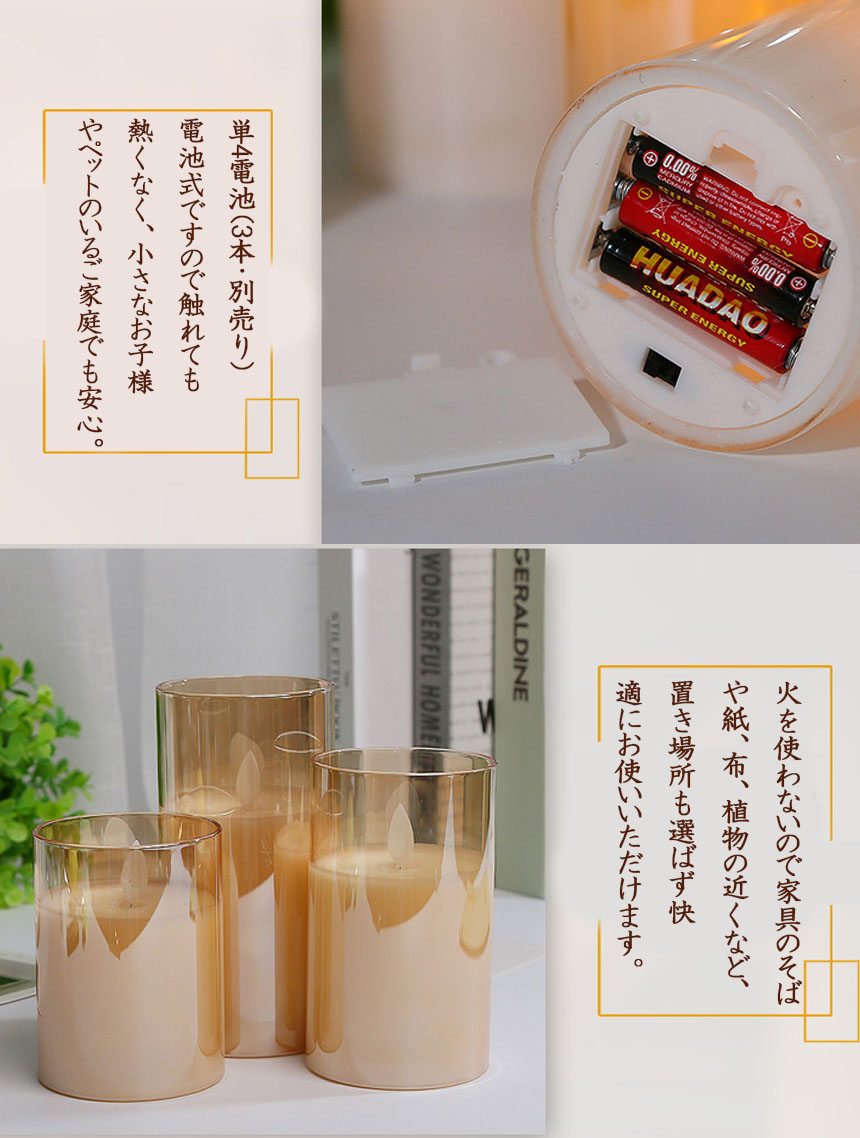 【安心安全】LEDで炎を表現しているため、触ったり倒してしまっても大丈夫。火災の危険やホットワックスの流入や有害な煙などのリスクを軽減します。お子様やペットがいるご家庭で、火