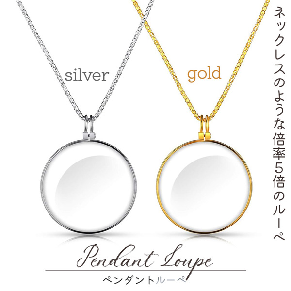 長めのチェーンが付いたシルバーとゴールドのカラーを選べる倍率5倍のルーペです。ネックレスのように首からぶら下げられ、使いたいとき直ぐに胸元からさっと使えます。