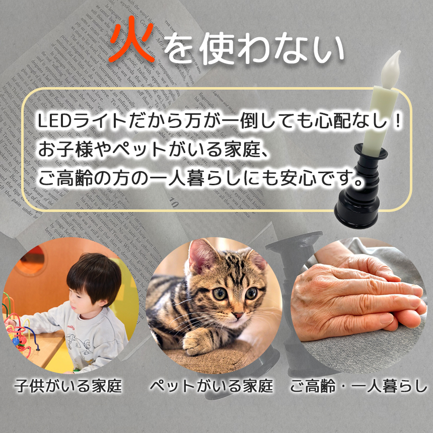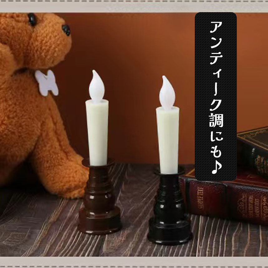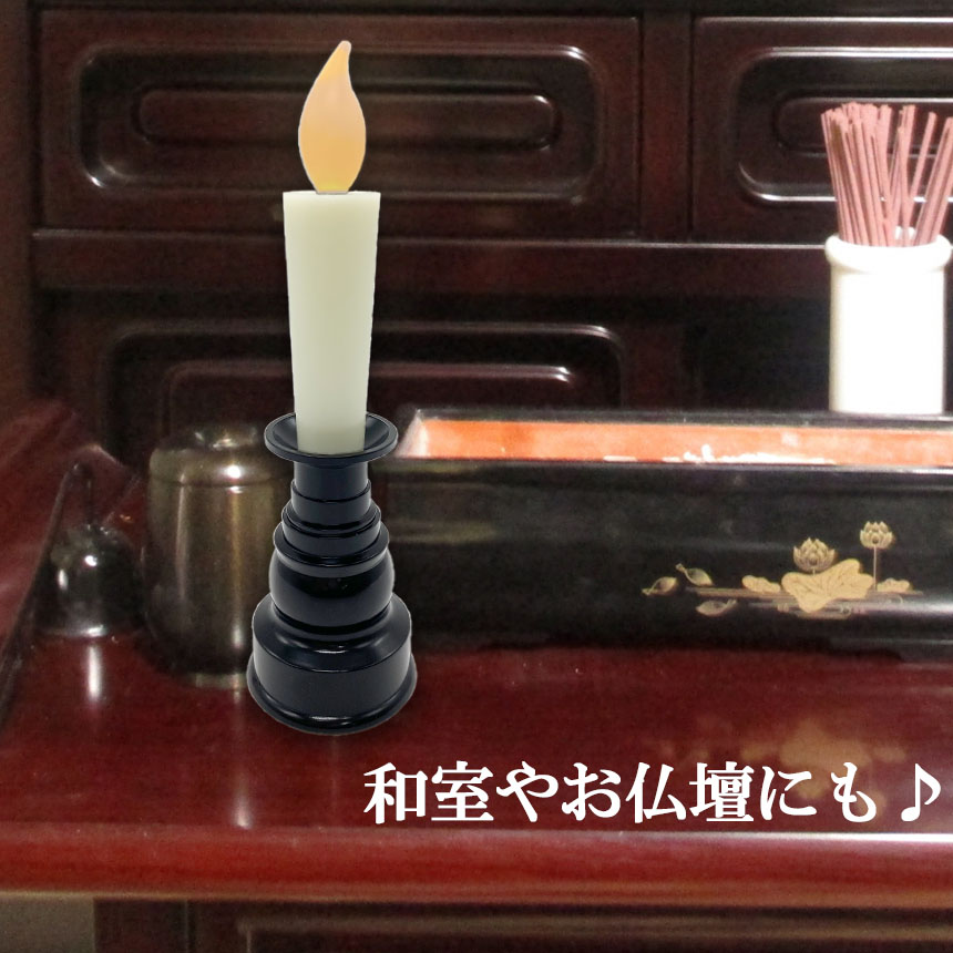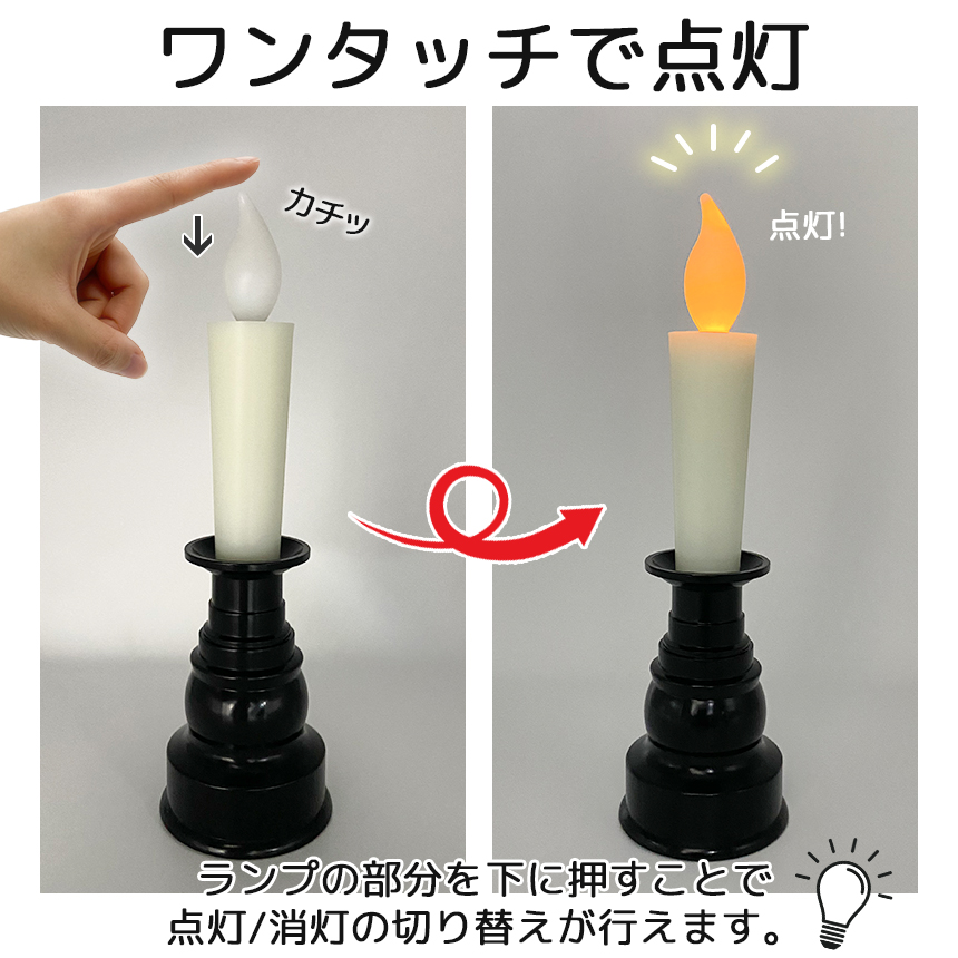 【火を使わない】従来のロウソクとは違い火を使わずLEDライトで光る!★ロウソクの煙や匂いが出ない★万が一倒しても火事などの心配がない★お子さんやペットがいるご家庭、ご年配の方の一人暮らしなどに最適【ワンタッチで点灯】ランプ部分を上から押すだけでライトのON/OFFの切り替えができます。【ゆらゆら光る】まるで本物の炎のようにゆらゆら揺れる光!暖かい光に癒されます♪【シンプルなデザイン】シンプルなデザインでインテリアとしてもお仏壇用としても使える!【選べるカラー】ブラック/ブラウン【サイズ】高さ:約20cm幅:約5.6cm