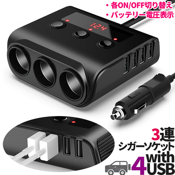 【車内に設置し各機器の電源に】車用のシガーソケット分配器です。一つのシガーソケットから、シガーソケット×3・USBポート×4に分配することが出来ます。【3.6Aの大容量電流で各種充電に対応】充電ケーブルなどを複数接続すると、電流が足りず充電できないことがあります。この分配器は通常の2A程度の物より大容量の3.6A出力のため、スマホ・タブレット等より多くの機器の充電が可能です。(必要な電流は機器によって異なります。容量オーバーにはご注意ください。)
