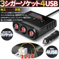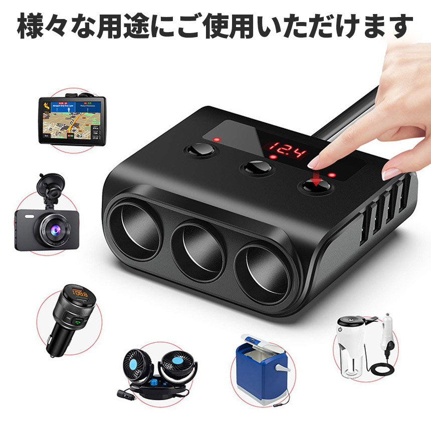 【車内に設置し各機器の電源に】車用のシガーソケット分配器です。一つのシガーソケットから、シガーソケット×3・USBポート×4に分配することが出来ます。