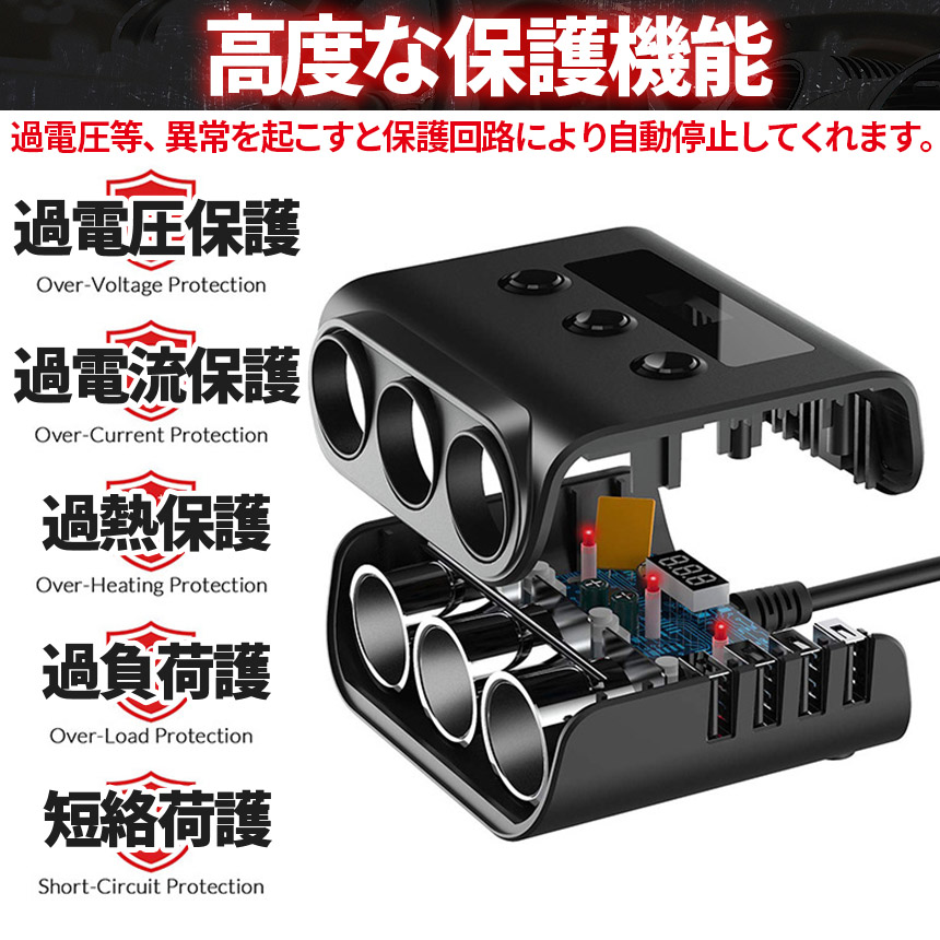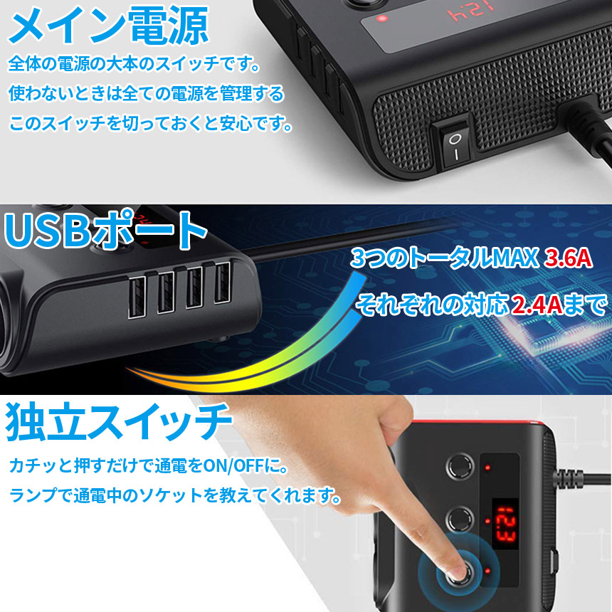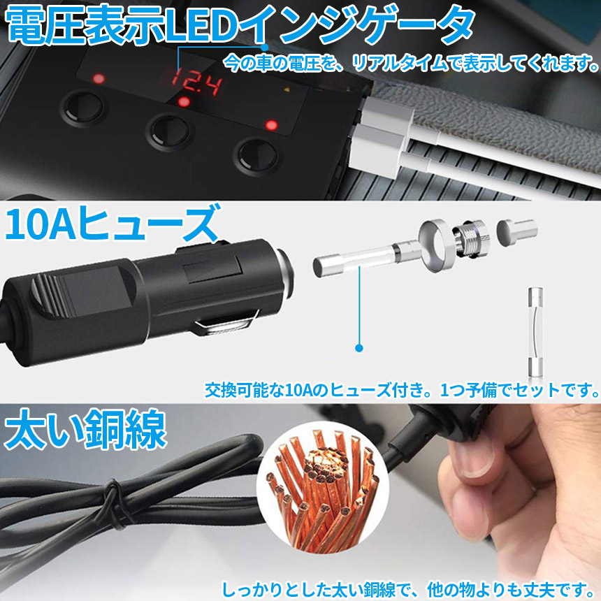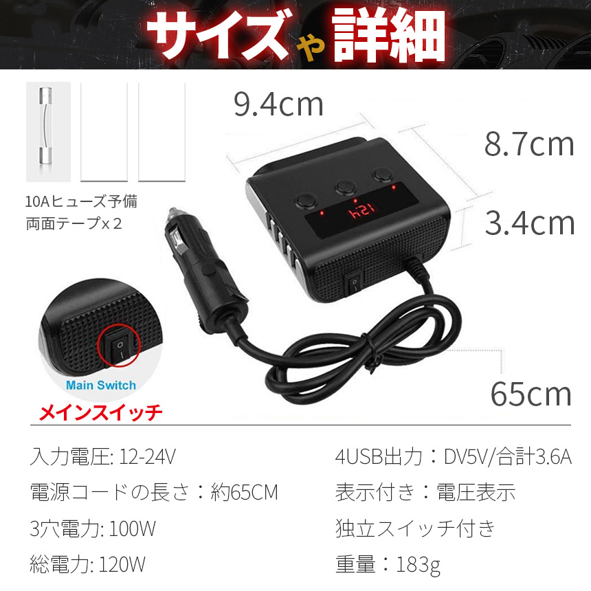 【製品仕様】入力電源:12V/24V (普通車やトラックでも使用可) 出力:シガーソケットx3口 USB(タイプA)x4ポート USB出力電圧:DC5V USB出力電流:3.6A(最大)予備ヒューズ、固定用両面テープ付