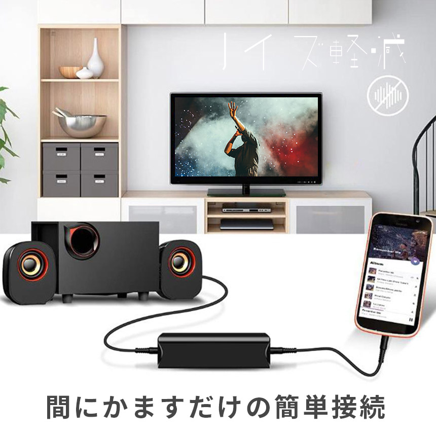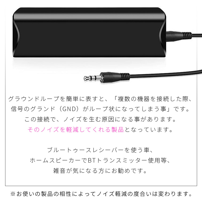 機器とスピーカー等の接続の際の間につけるだけの簡単接続(3.5mmジャック対応)。特に、ブルートゥース化できるトランスミッター、BTレシーバーを使った機器や車などで発生しやすいノイズを軽減します。