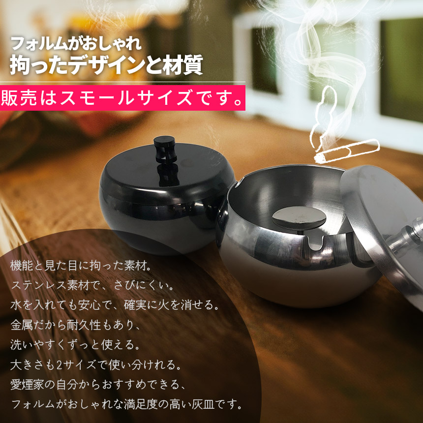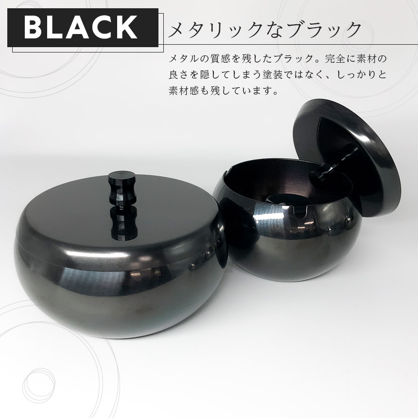【ステンレス製お洒落なフォルムの灰皿】ブラック:メタリックなブラックで、質感もいいです。素材の風合いを損なわない塗装が施されています。シルバー:フタ、ボディー、取っ手を異なる磨きで磨かれたシルバー。しかし、大きな差があるわけではないので、統一感がありこだわりを感じます。使い込むほどについていく傷も味となり、一層その無個性を個性に変えていくようなシルバーです。水を入れても、そのままでもお使いいただけます。蓋をすれば、臭いや家事の予防にもなります。(火事防止のため、水を入れてのご使用をお勧めします。)