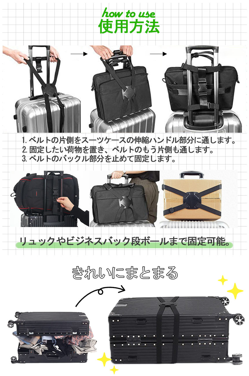 【商品説明】旅行中荷物が多くても安心!スーツケース固定ベルトキャリーケースでの移動中…・荷物が多い・キャリーケースにものを詰め込みすぎた・荷物の取り違いが怖い・すべての荷物をコンパクトにまとめたい。…そんな時に活躍します!