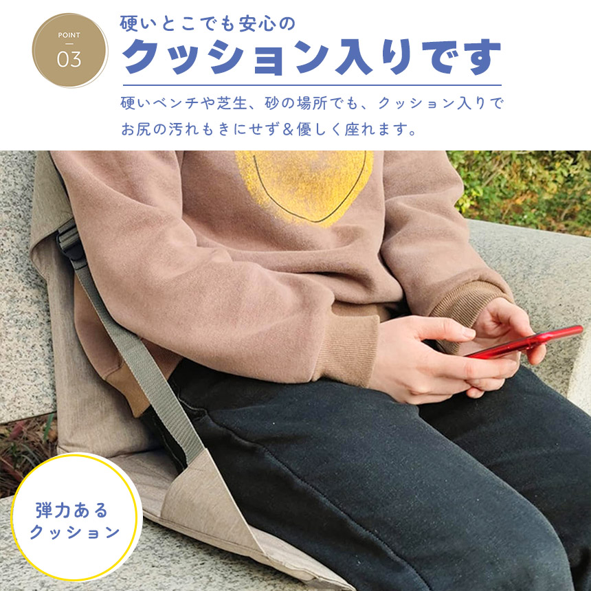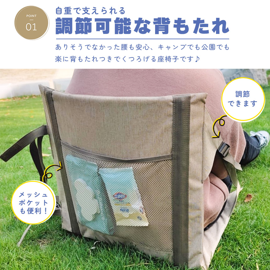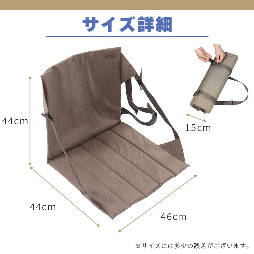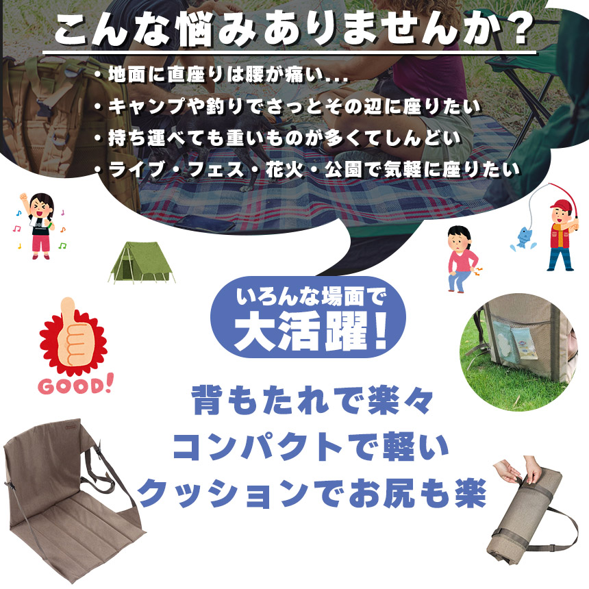 【コンパクトなどこでも座椅子】丸めてコンパクト!簡単ポンと開けば使いたいときにすぐ使える!腰や、地面を気にせずどんな場面でも大活躍です♪椅子の背面に収納できるメッシュポケット付きで便利!フラットにすれば2人掛けのクッションにもなって2WAY!【コンパクト・軽量】折りたためば約44×15cmのコンパクトサイズで、ショルダーや手持ちにできる調節可能な持ち手もついていて持ち運びも楽々!重量も約615gと超軽量なので、荷物がかさばらず、重くならず持ち歩けます。旅行やライブ、フェス、釣り、キャンプなど、遠出をするときにもぴったり!