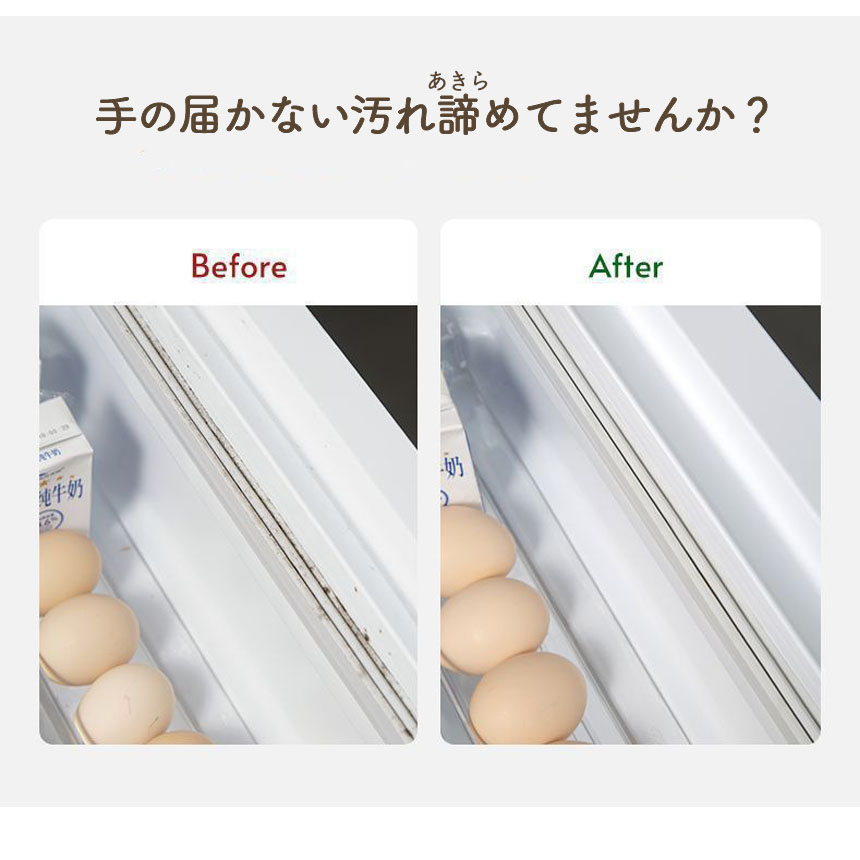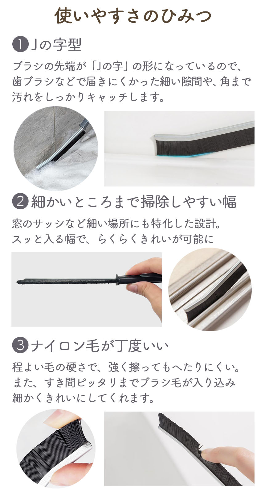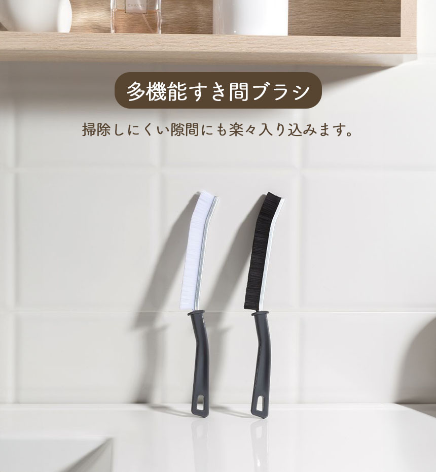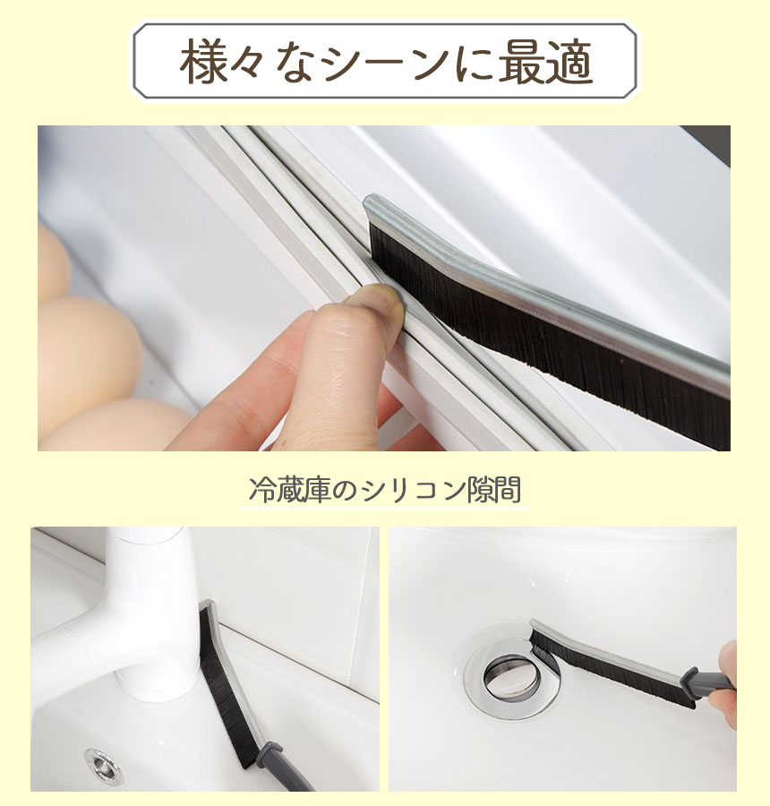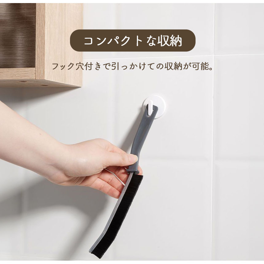 ブラシの先端が曲がっておりJの字のような形になっています。すき間にしっかりとフィットするので、細い隙間や掃除しづらい角などの汚れもしっかりときれいにします。