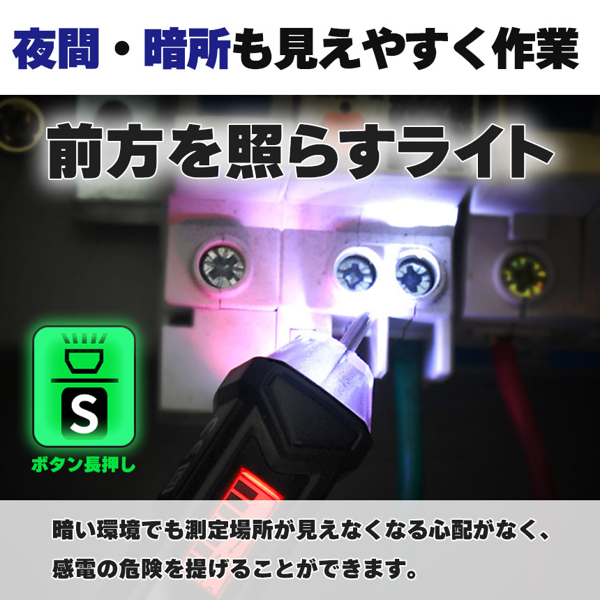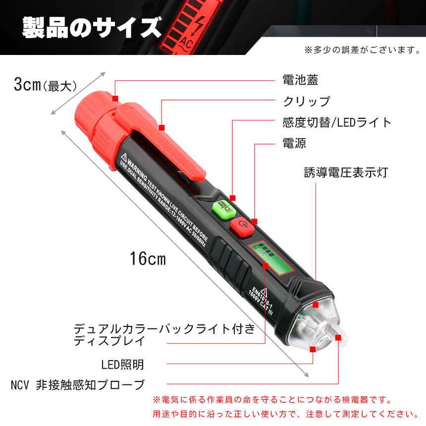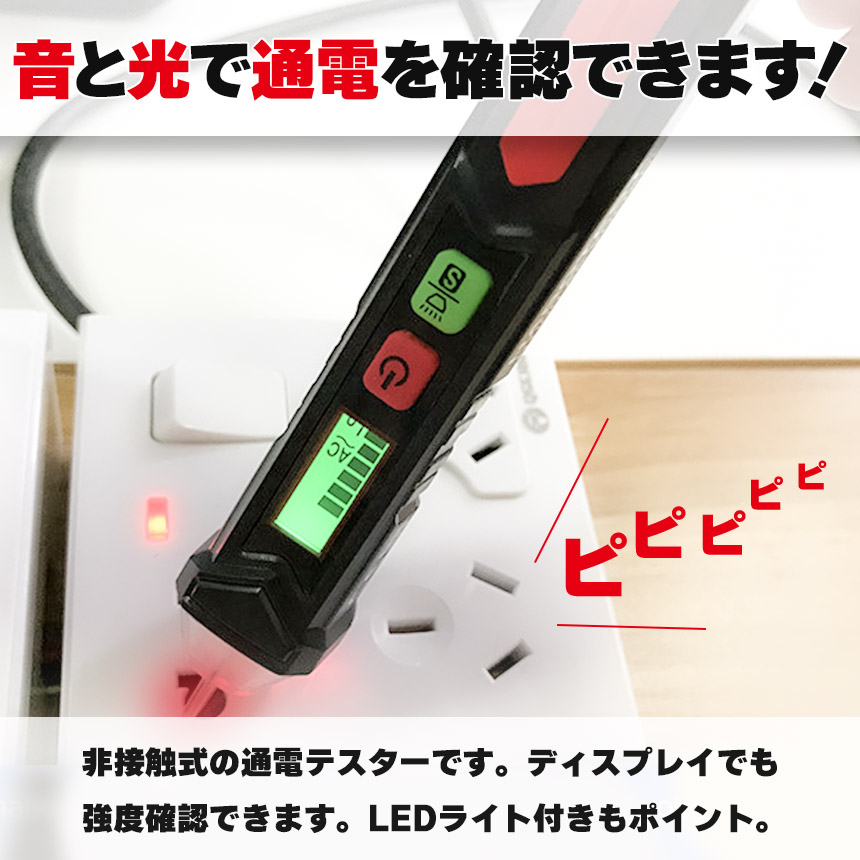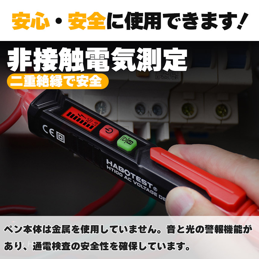 非接触検電テスターペン、AC48V-1000V、AC12-1000V切り替え可能で、音と光で通電をお知らせ【ペンタイプで非接触の安全ツール】・非接触設計で感電の危険が少なく安全です。・ペンタイプで持ちやすい設計。・音と光とディスプレイでわかりやすくお知らせします。・LEDライト付きで暗所でも安全に。・クリップタイプでポケットから落としません。