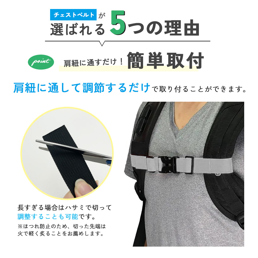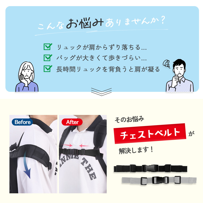 ●肩からずり落ちを防止する! チェストベルト●こんなお悩みはありませんか?・リュックが肩からずり落ちる…・バッグが大きくて歩きづらい…・長時間リュックを背負うと肩が凝る