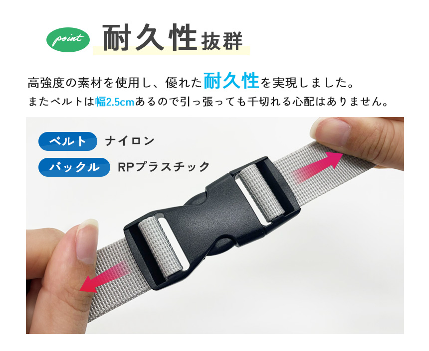 またベルトは幅2.5cmあるので引っ張っても千切れる心配はありません。