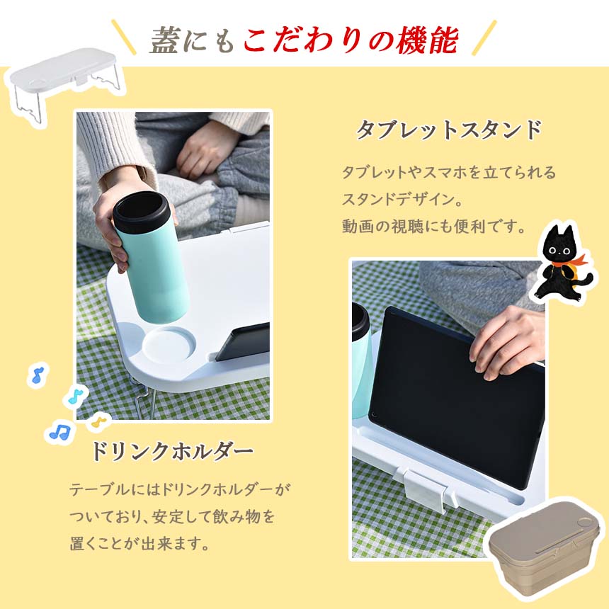 さらに蓋にはドリンクホルダーとタブレットスタンド付きのこだわり仕様です。