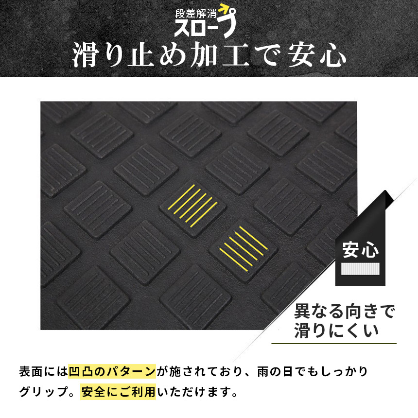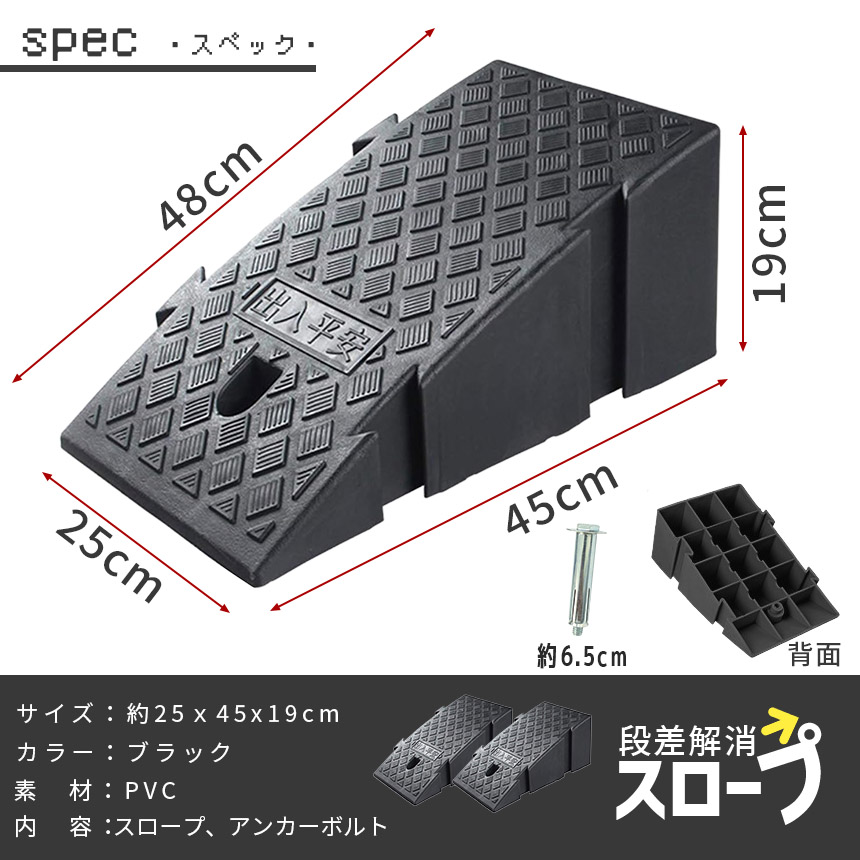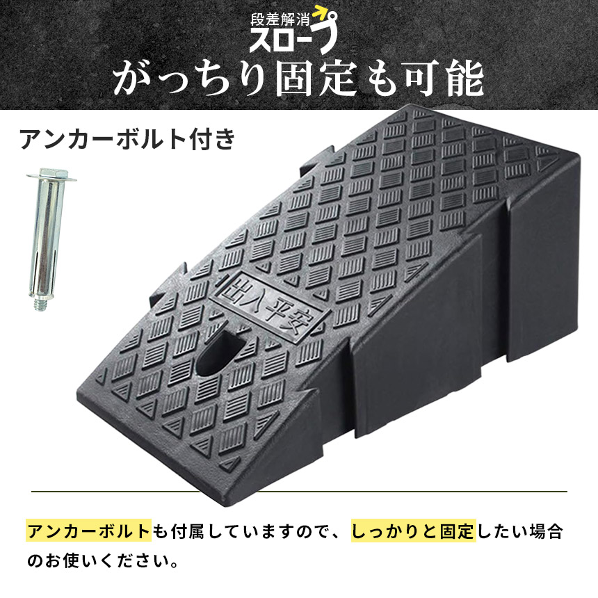 段差スロープ 段差解消スロープ 2個SET 段差プレート 車 車庫 ガレージ 駐車場 玄関 入口 店舗 台車 車椅子 ベビーカー バイク バリアフリー 滑り止め 耐久性 PVC製 屋外用 高さ19cm 段差 擦らない 倉庫 店舗入り口 アンカーボルト付き