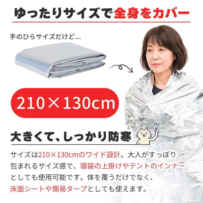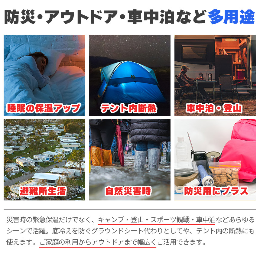 アウトドア・登山・釣り・キャンプ・フェス・車中泊はもちろん、災害時や停電時の防寒対策にも。軽くて丈夫な素材は繰り返し使用可能で、防災バッグに常備しておくと安心です。