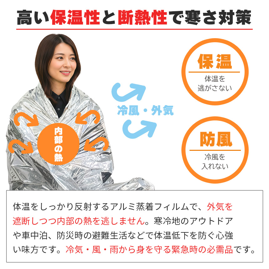体温をしっかり反射するアルミ蒸着フィルムで、外気を遮断しつつ内部の熱を逃しません。寒冷地のアウトドアや車中泊、防災時の避難生活などで体温低下を防ぐ心強い味方です。冷気・風・雨から身を守る緊急時の必需品です。