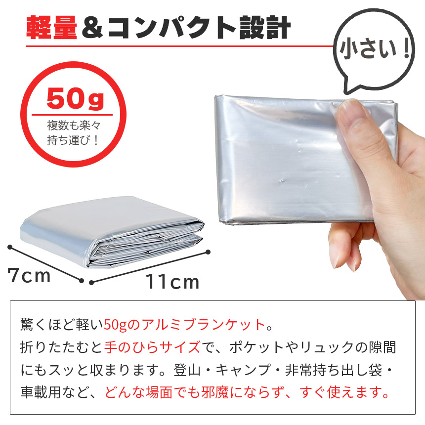 驚くほど軽い50gのアルミブランケット。折りたたむと手のひらサイズで、ポケットやリュックの隙間にもスッと収まります。登山・キャンプ・非常持ち出し袋・車載用など、どんな場面でも邪魔にならず、いざという時にすぐ使えます。