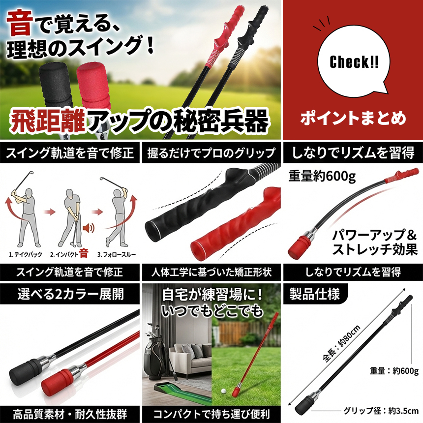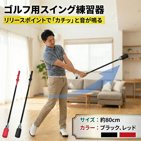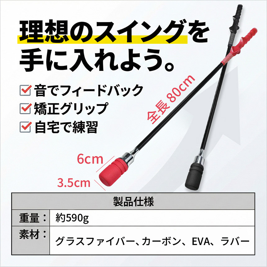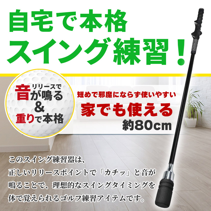 全長80cmの程よい長さで、振り抜きやすく、室内でも使いやすい設計。初心者から中級者まで、毎日の素振り練習に最適です。