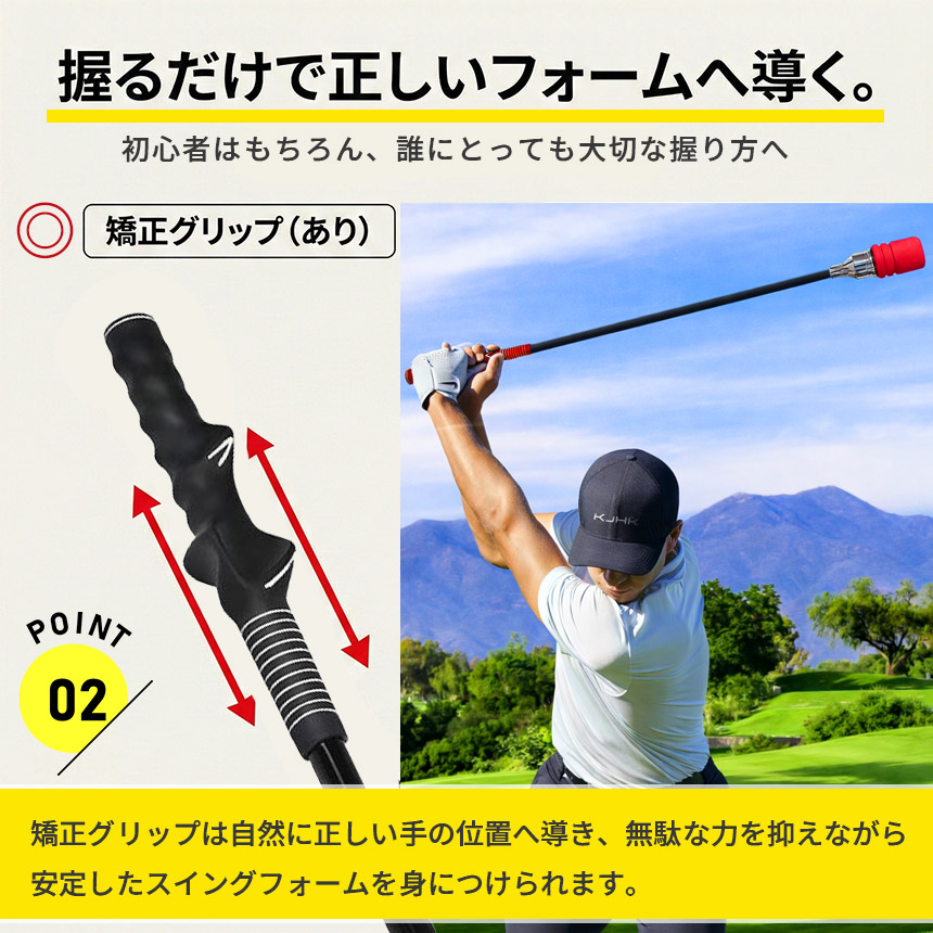 手の位置が自然に整う矯正グリップを採用。無駄な力を使わず、正しいグリップ感覚を身につけることで、スイング全体の安定につながります。